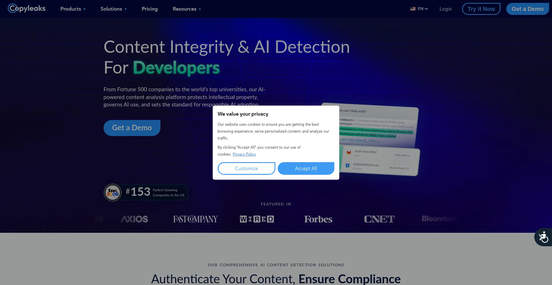 该网站实现符合GDPR或CCPA等隐私法规的cookie同意机制。这表明 copyleaks.com 遵守数据保护标准并为用户提供对个人数据收集实践的控制。
