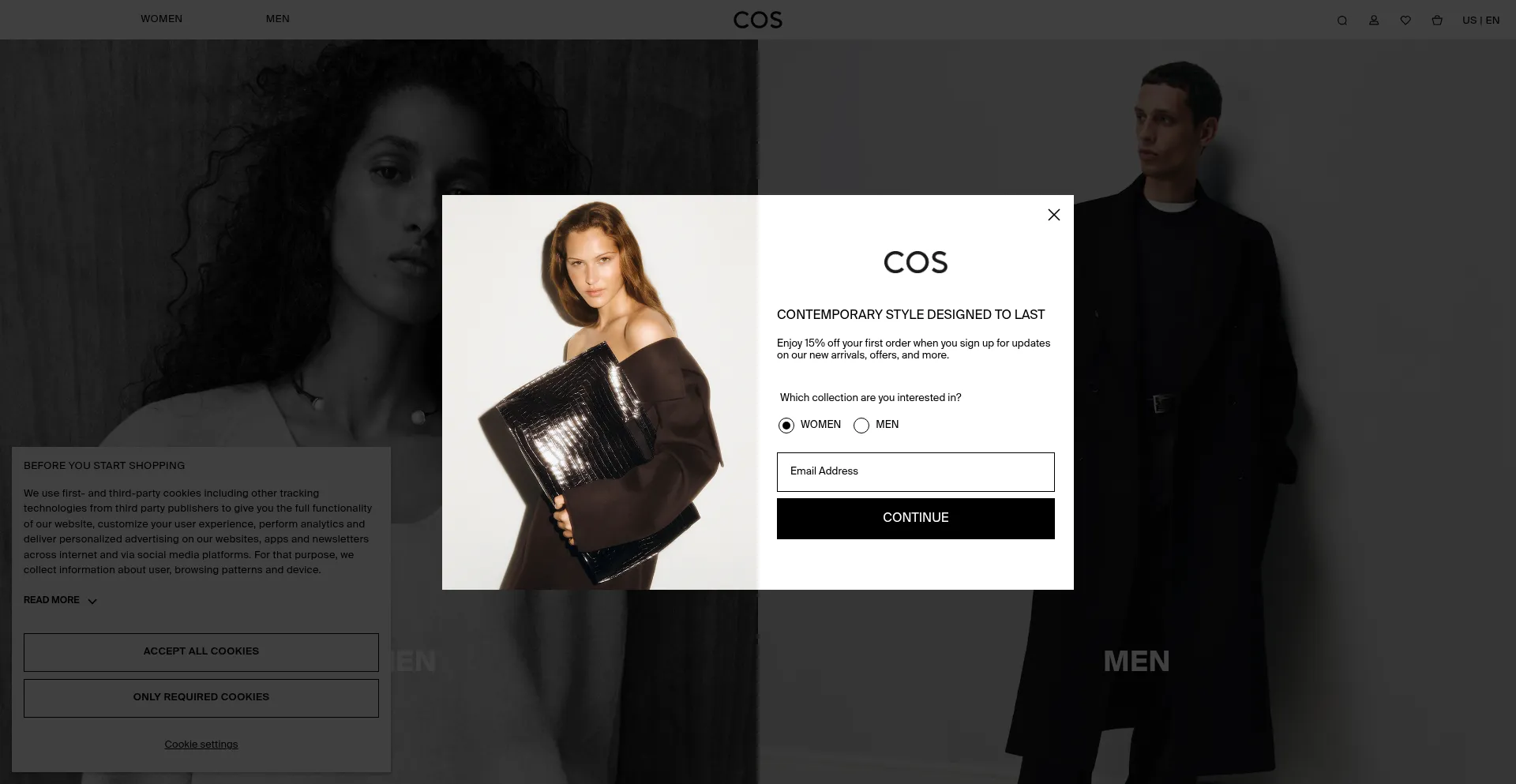 该网站实现符合GDPR或CCPA等隐私法规的cookie同意机制。这表明 cos.com 遵守数据保护标准并为用户提供对个人数据收集实践的控制。