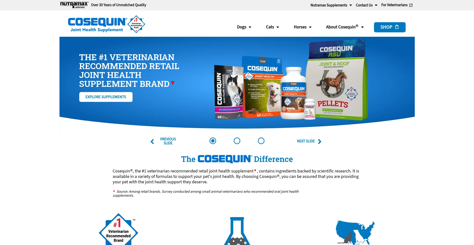Cosequin®, the #1 veterinarian recommended joint supplement brand, has supplements in a variety of formulas to meet the specific needs of your dog, cat or horse.