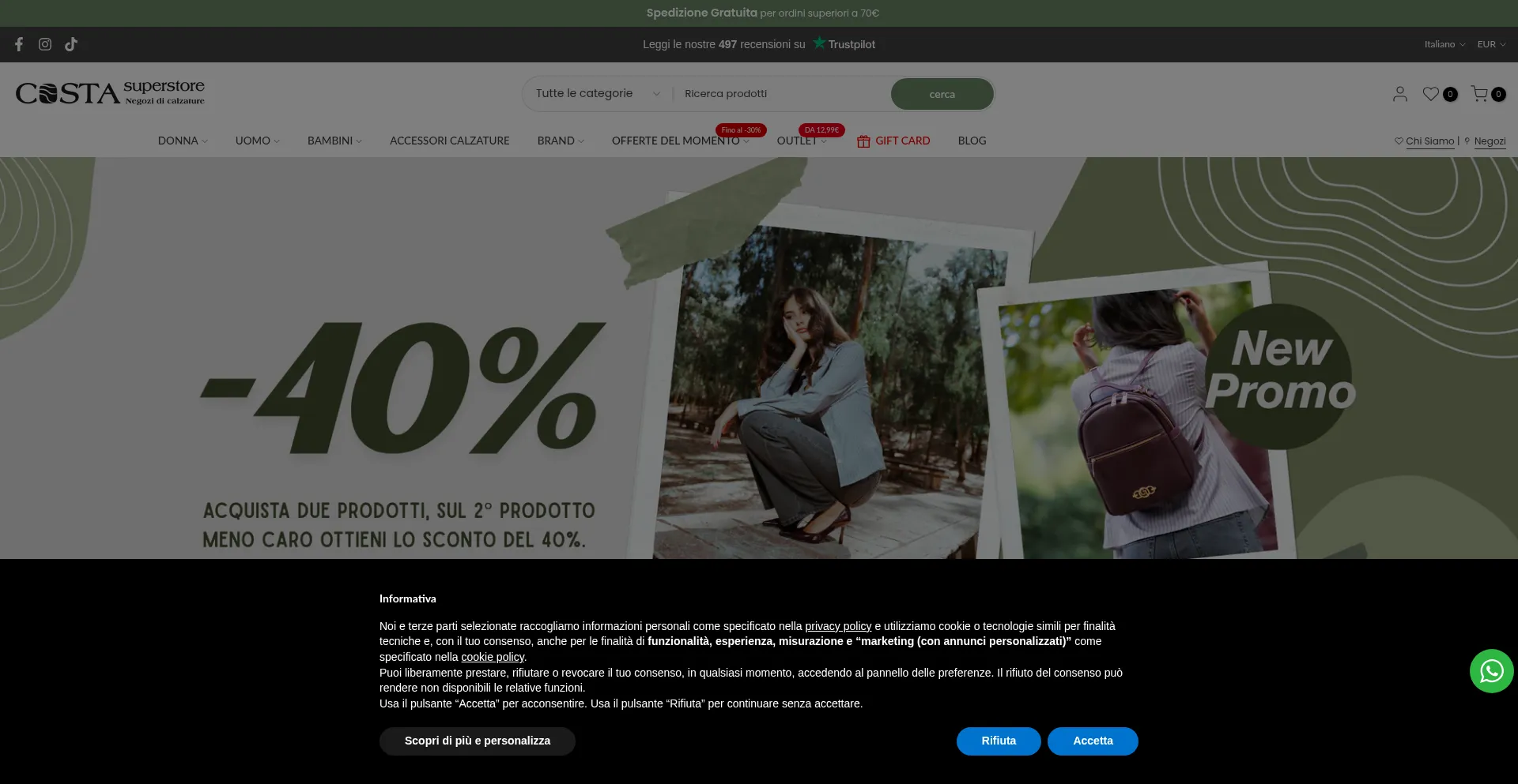 Scopri le calzature perfette per te e la tua famiglia su Costa Superstore Calzature. Ampia selezione di sneakers, sandali, decolleté, ciabatte e altro ancora. Completa il tuo s...
