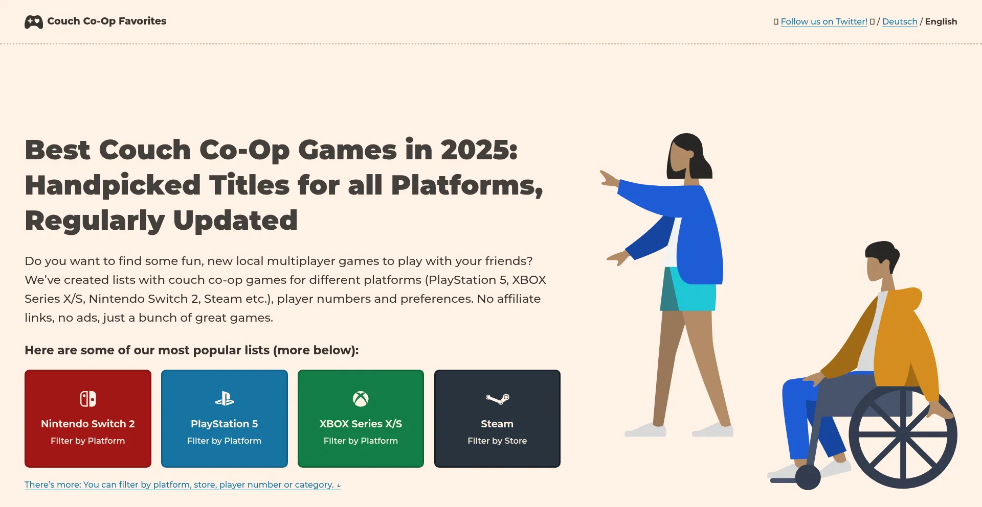 Find fun, new couch co-op games for PS5, XBOX Series X/S, Switch, Steam etc. We create lists with recommendations for all platforms and player numbers.