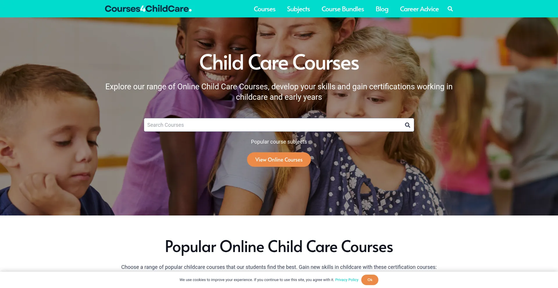 该网站实现符合GDPR或CCPA等隐私法规的cookie同意机制。这表明 courses4childcare.co.uk 遵守数据保护标准并为用户提供对个人数据收集实践的控制。