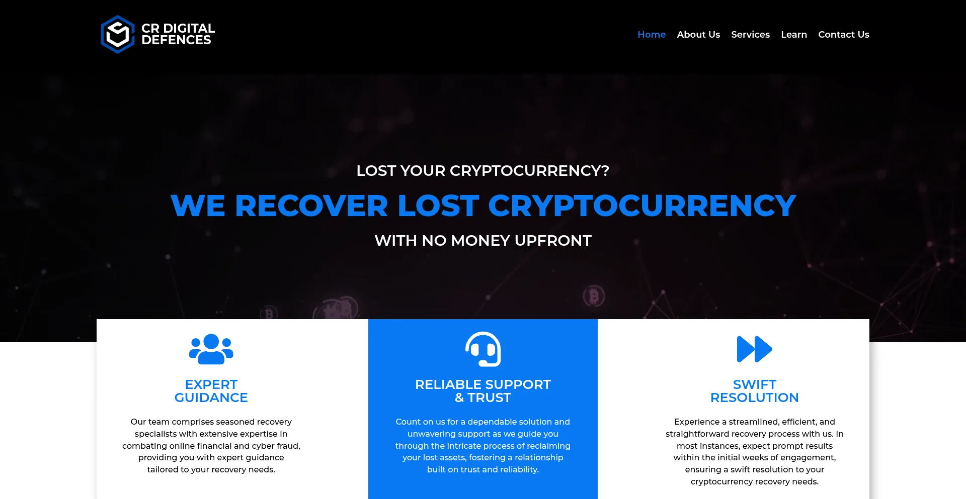 网站 cr-digitaldefence.com 宣传针对丢失或被盗资产的资金恢复服务。虽然一些在应急费用结构上运营,其他可能需要预付款,这可能表明欺诈运营。在聘请此类服务前验证凭据和监管合规性。