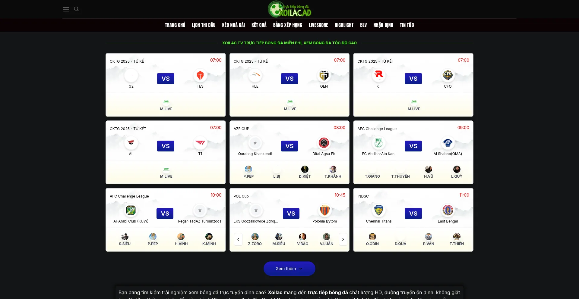 Xoilac TV mang đến trực tiếp bóng đá tốc độ cao, chất lượng HD sắc nét, hoàn toàn miễn phí. Cập nhật lịch, kết quả & tin tức bóng đá n...