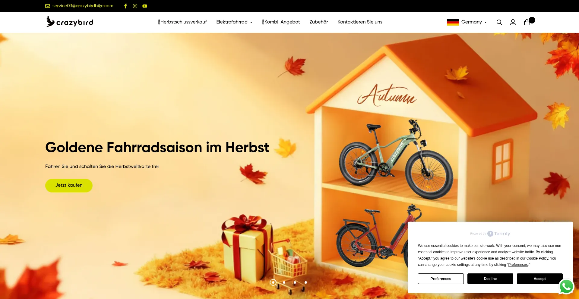该网站实现符合GDPR或CCPA等隐私法规的cookie同意机制。这表明 crazybirdbike.de 遵守数据保护标准并为用户提供对个人数据收集实践的控制。