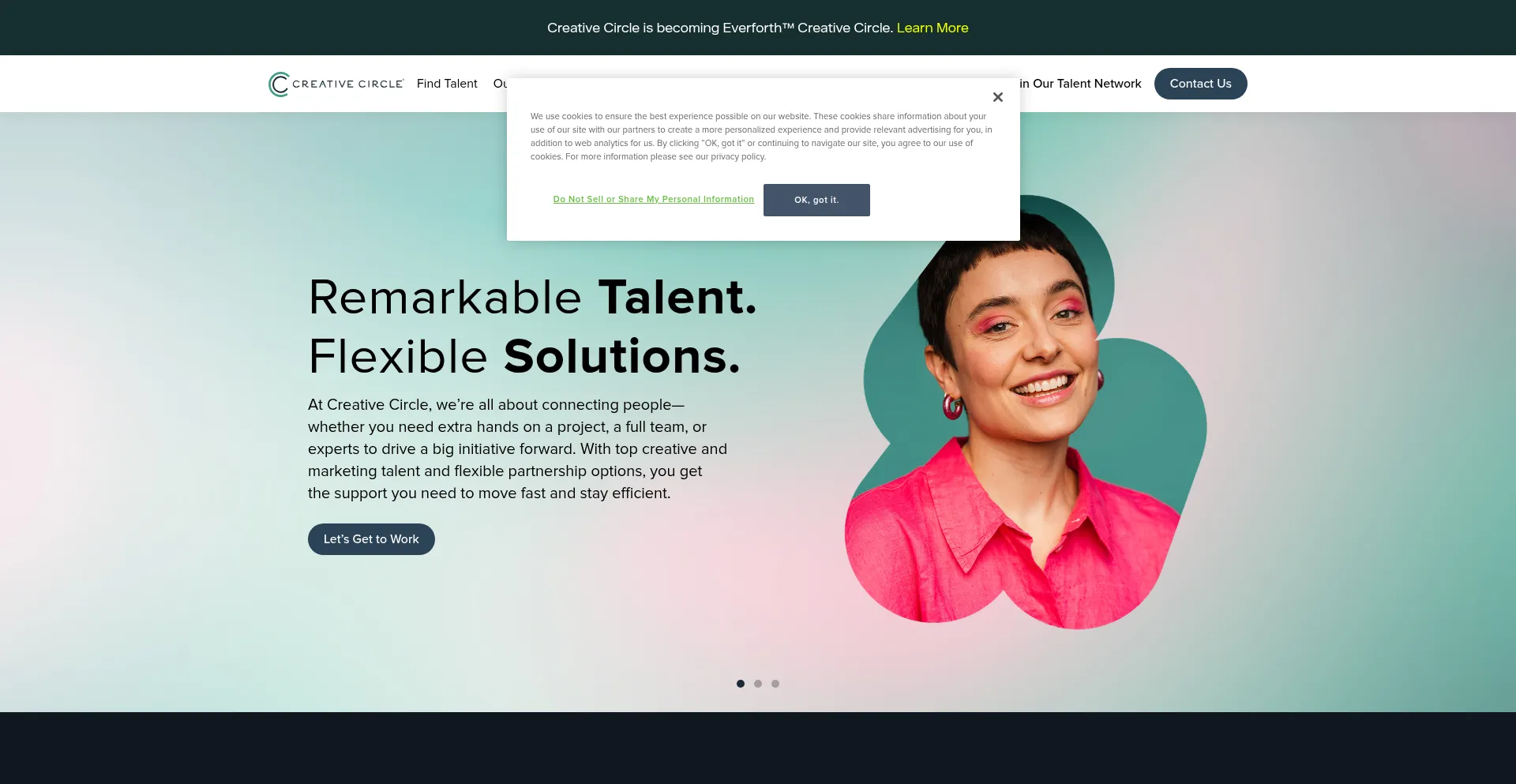 该网站实现符合GDPR或CCPA等隐私法规的cookie同意机制。这表明 creativecircle.com 遵守数据保护标准并为用户提供对个人数据收集实践的控制。