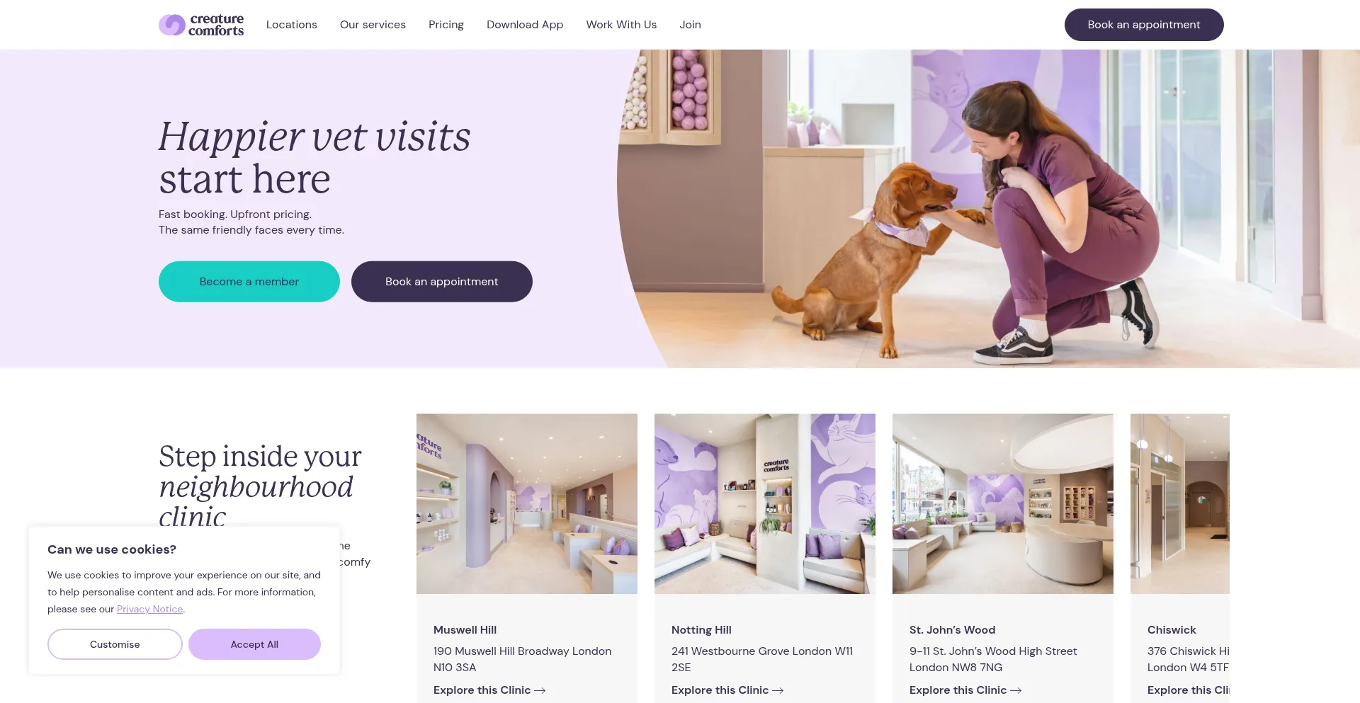 Visit Creature Comforts' state-of-the-art vet clinics in Notting Hill, St. John's Wood, Chiswick, Barnet, St. Albans, Putney and Chelsea, or live chat with our friendly team. Ve...