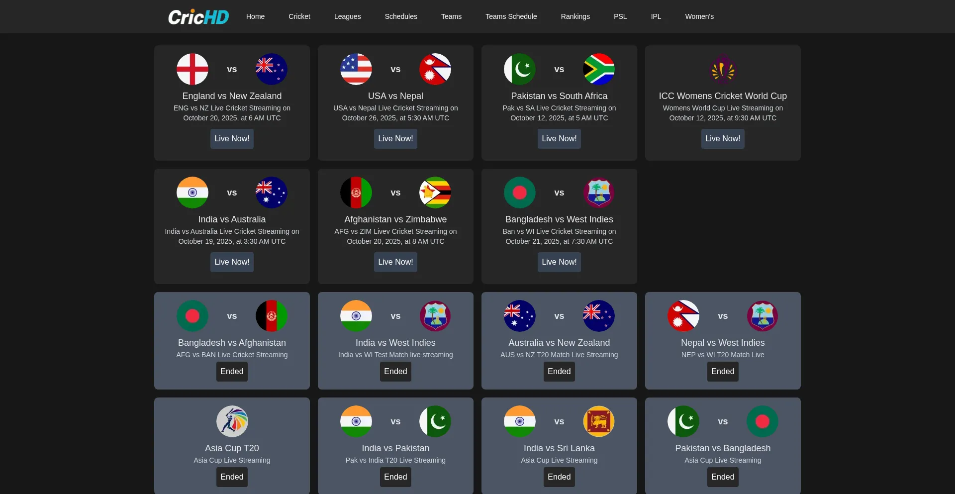 Watch Live Cricket Streaming Online on our website CricHD. India vs Australia, Pak vs SA, Eng vs NZ and Ban vs WI match streams on pc and mobile.