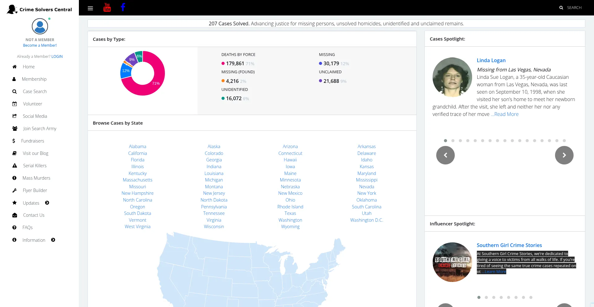 该网站实现数据收集表单,请求个人信息,包括姓名、电子邮件地址、电话号码或其他敏感详细信息。用户应验证 crimesolverscentral.com 的合法性并在提交个人数据前查看隐私政策。