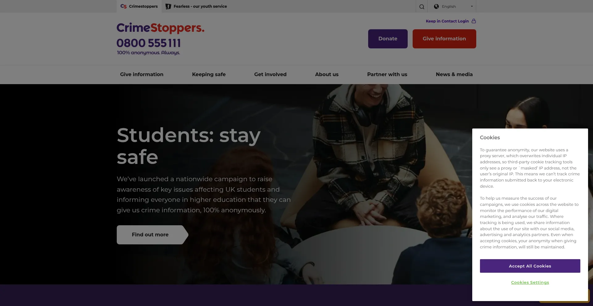 该网站实现符合GDPR或CCPA等隐私法规的cookie同意机制。这表明 crimestoppers-uk.org 遵守数据保护标准并为用户提供对个人数据收集实践的控制。