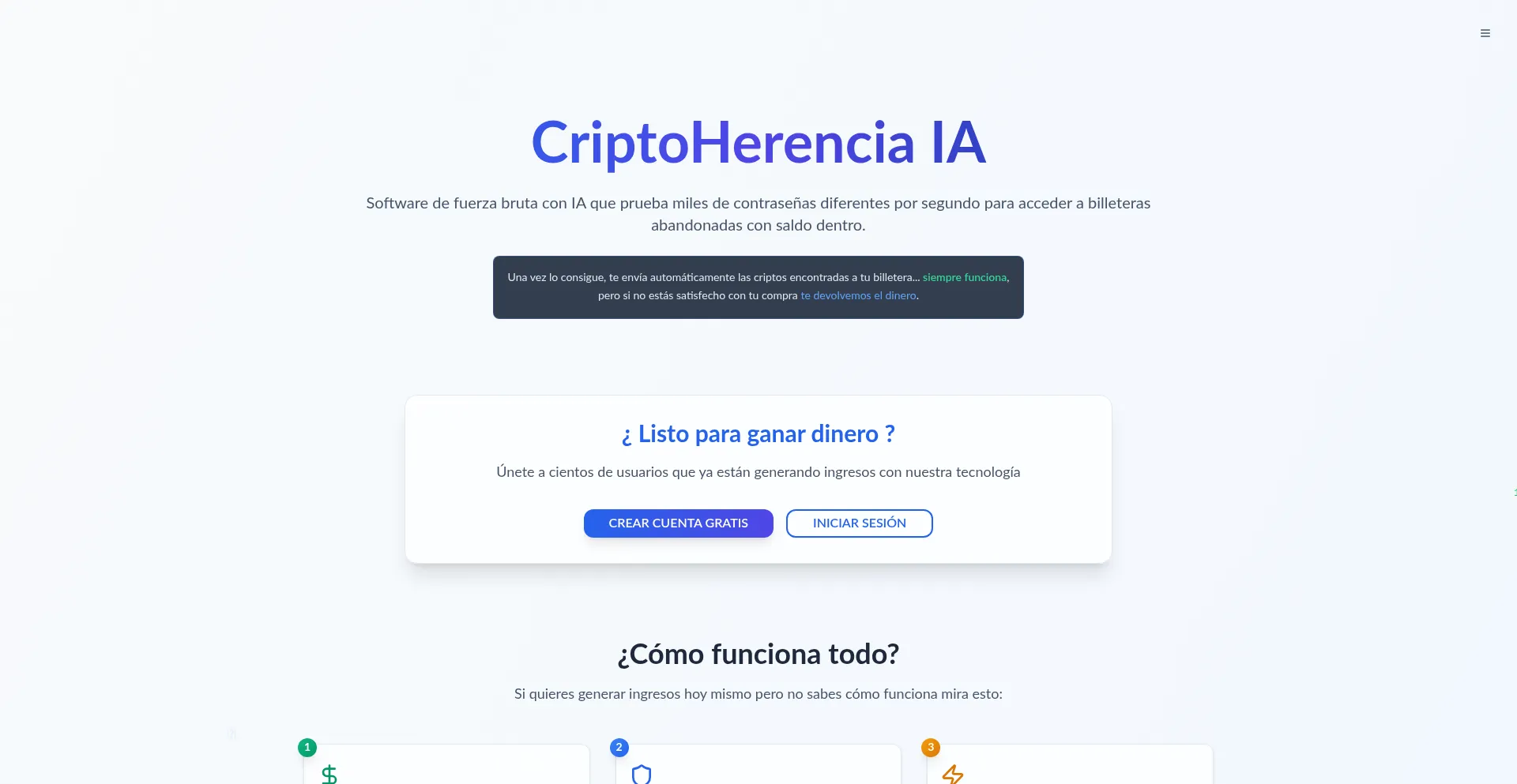 🚀 CriptoHerencia.io - Plataforma #1 para ganar dinero online con criptomonedas. Recupera wallets perdidas de Bitcoin, Ethereum, Solana. Sistema profesional de ataque a wallet...