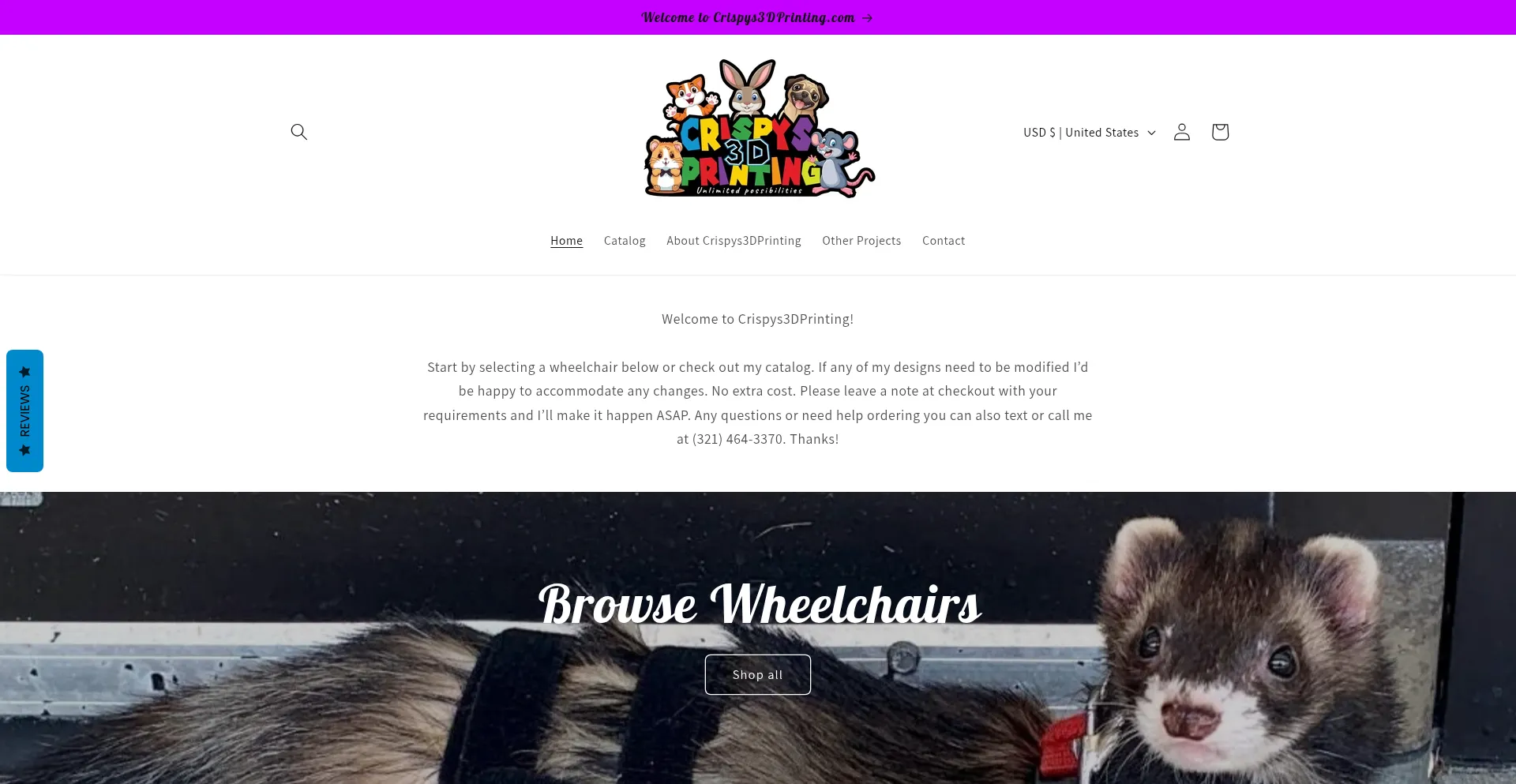 Crispys3DPrinting specializes in 3D modeling, design, and manufacturing small animal wheelchairs. Helping our friends get around a little easier.