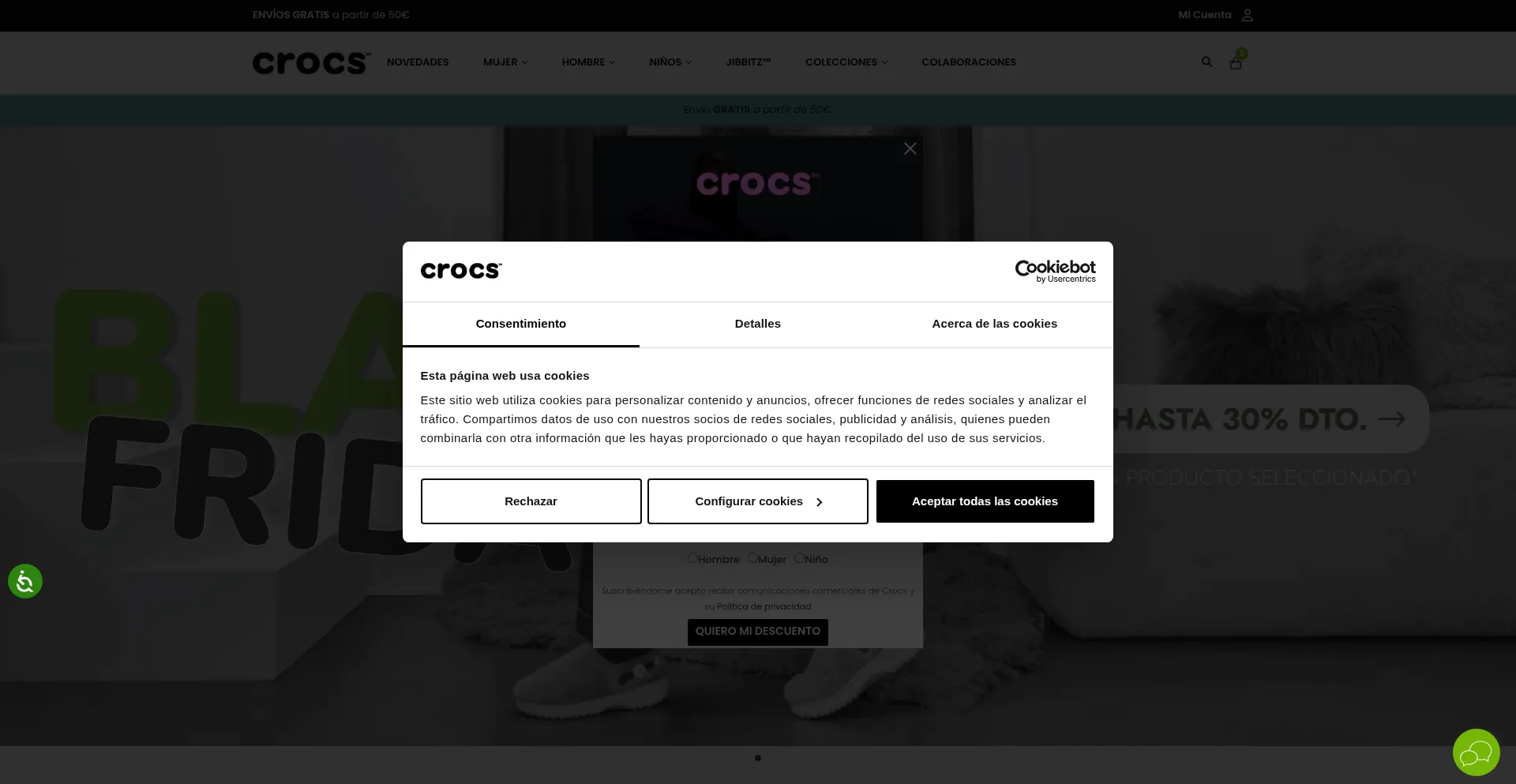 该网站实现符合GDPR或CCPA等隐私法规的cookie同意机制。这表明 crocs.es 遵守数据保护标准并为用户提供对个人数据收集实践的控制。