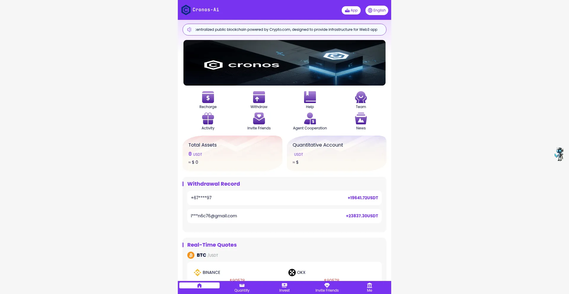Cronosai.one 运营欺诈性金融平台,推广具有不现实回报承诺的欺骗性投资机会。安全分析表明该平台采用与 庞氏骗局 和预付费欺诈一致的策略,旨在提取用户资金和个人信息。