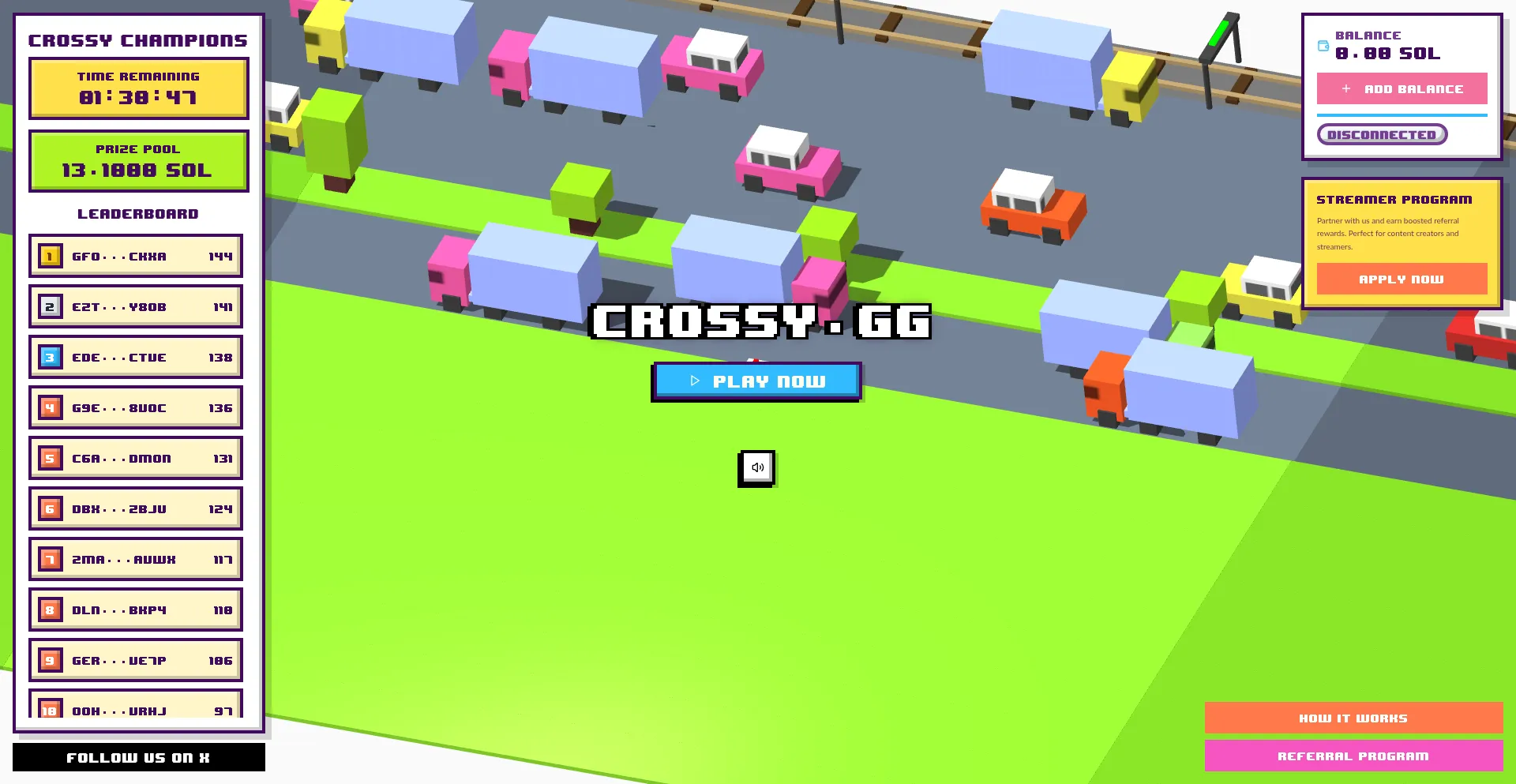Play Crossy on Solana! Compete in tournaments, climb the leaderboards, and win the pot.
