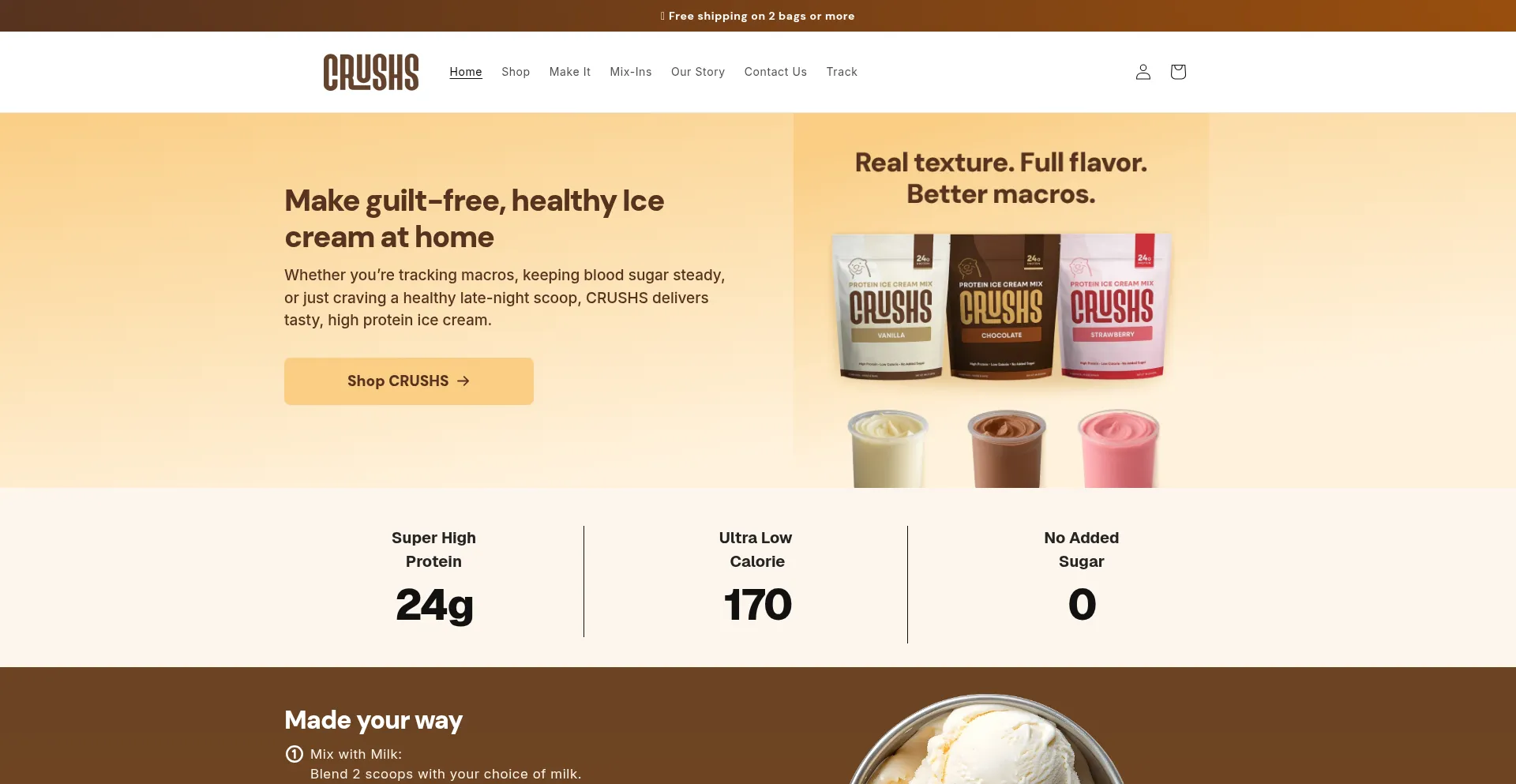 CRUSHS is a natural, high-protein, low calorie, low sugar ice cream mix you make at home. All clean ingredients. Creamy, tasty flavor. Just blend, freeze, and enjoy a healthy, m...