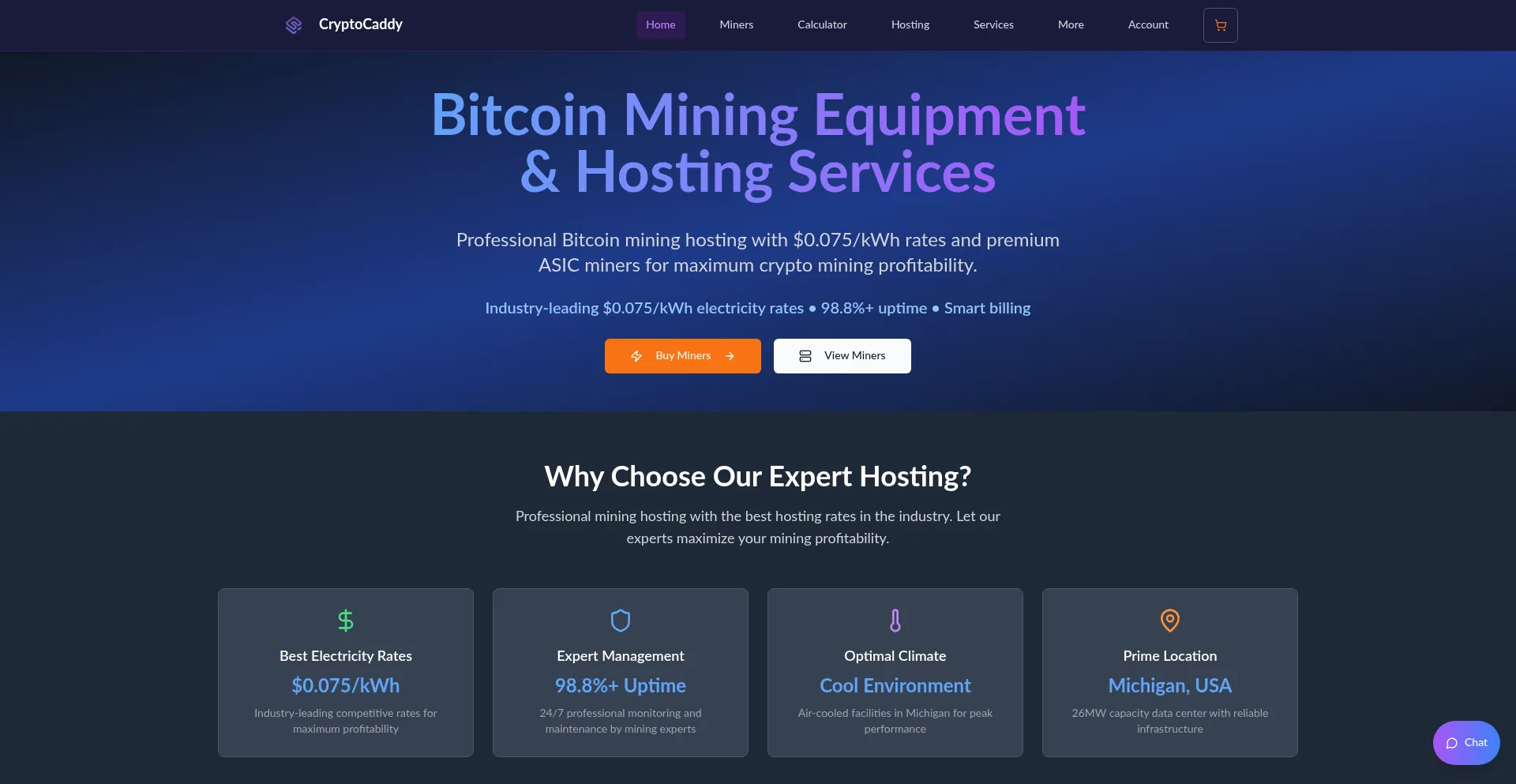 CryptoCaddy offers premium ASIC miners for Bitcoin, Dogecoin & cryptocurrencies. Professional hosting with $0.075/kWh rates, 98.8%+ uptime, and expert guidance.