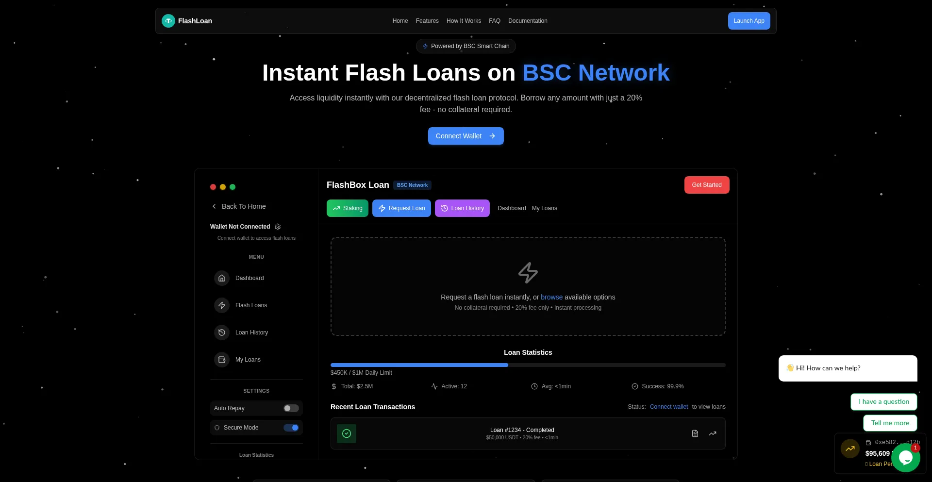 Access instant flash loans on BSC Smart Chain with just 10% fee. No collateral required. Secure, fast, and transparent DeFi lending protocol.