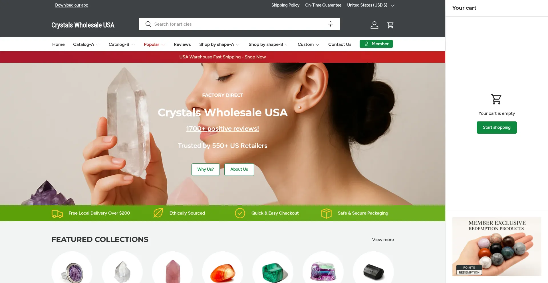 分析表明 crystalswholesaleusa.com 作为电子商务平台运营,促进商品或服务的在线交易。该网站实现了购物车功能、支付处理系统和产品目录功能,这些是商业零售运营的典型特征。