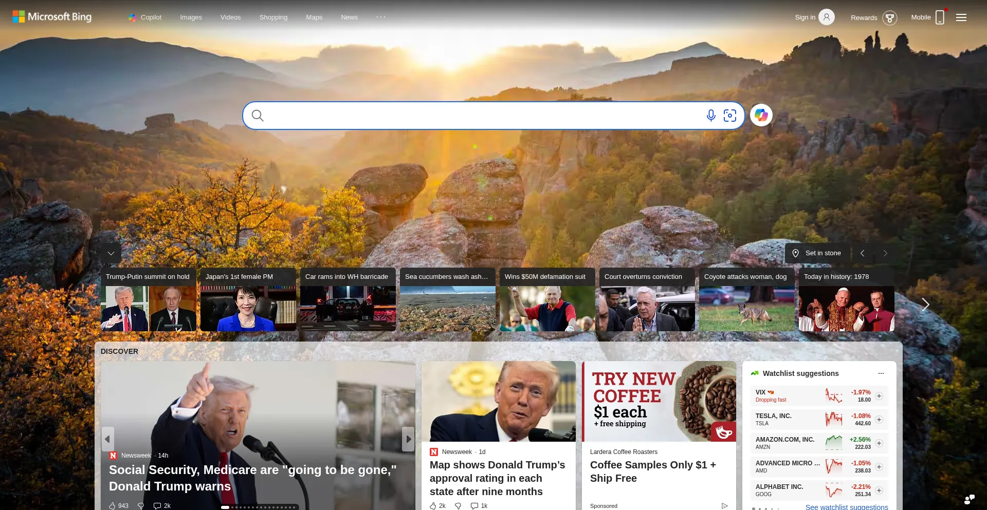 Search with Microsoft Bing and use the power of AI to find information, explore webpages, images, videos, maps, and more. A smart search engine for the forever curious.