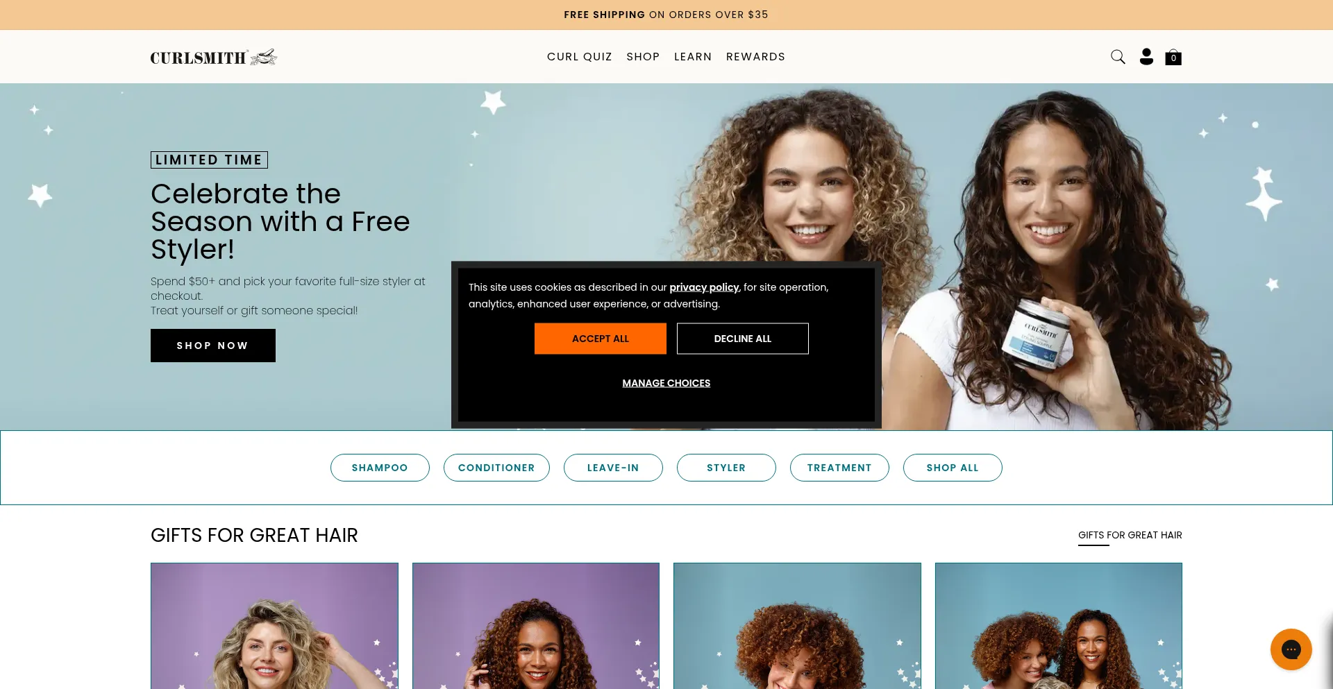 该网站显示来自认可机构的安全认证或信任印章,表明符合安全标准、数据保护协议或行业法规。来自 curlsmith.com 的信任印章表明遵守已建立的安全实践和运营透明度。