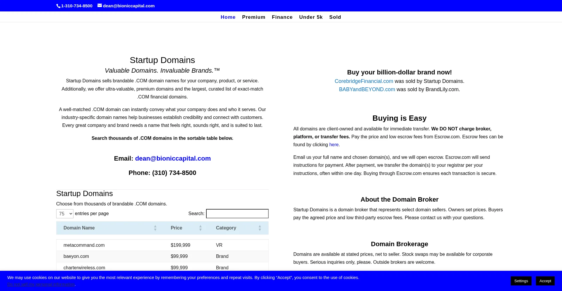 Startup Domains offers premium .COM domains and brands for sale. Buyers pay the agreed price plus ultra-low escrow fees only. (310) 734-8500