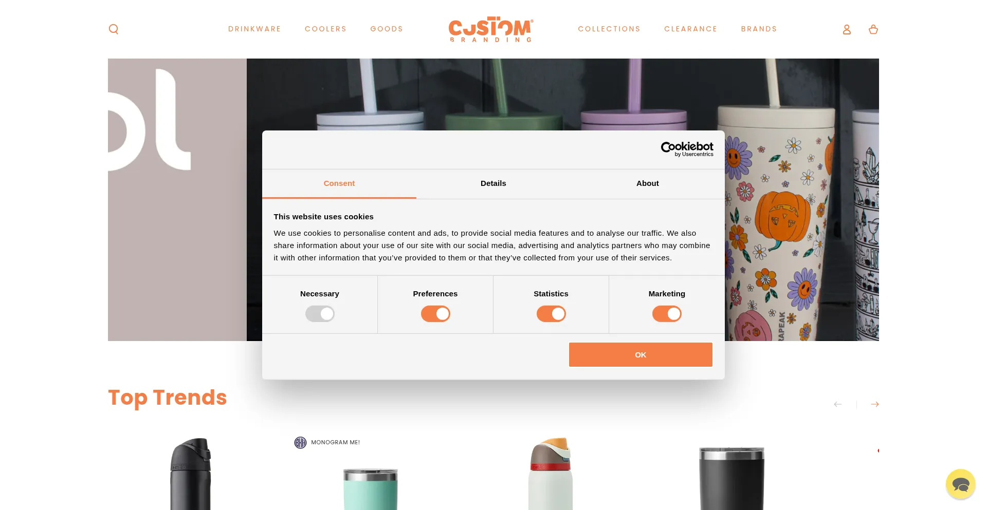 该网站实现符合GDPR或CCPA等隐私法规的cookie同意机制。这表明 custombranding.com 遵守数据保护标准并为用户提供对个人数据收集实践的控制。