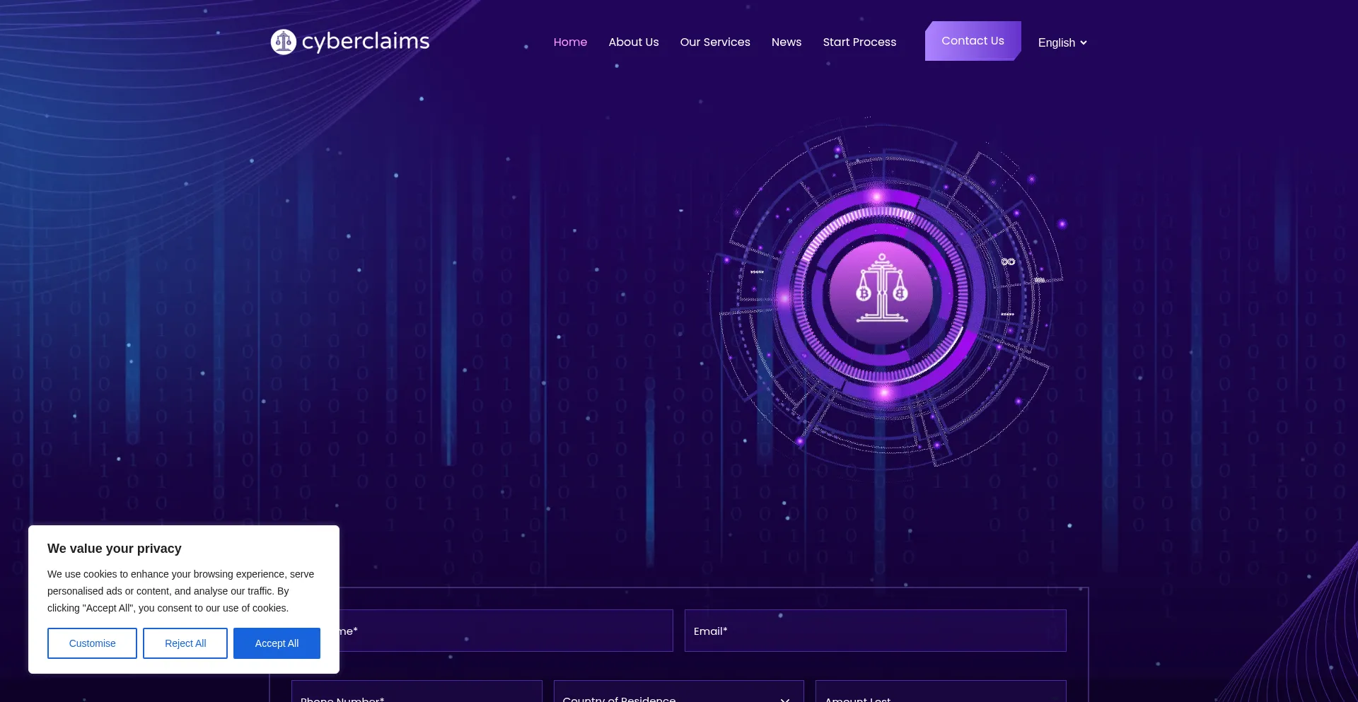 网站 cyberclaims.net 宣传针对丢失或被盗资产的资金恢复服务。虽然一些在应急费用结构上运营,其他可能需要预付款,这可能表明欺诈运营。在聘请此类服务前验证凭据和监管合规性。
