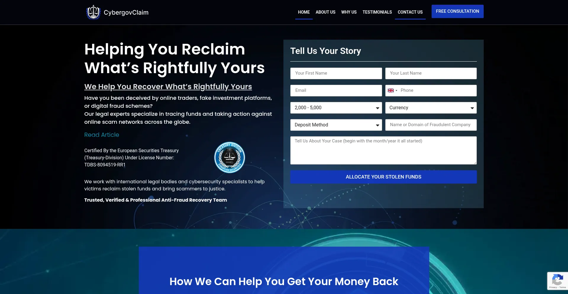 网站 cybergovclaim.com 宣传针对丢失或被盗资产的资金恢复服务。虽然一些在应急费用结构上运营,其他可能需要预付款,这可能表明欺诈运营。在聘请此类服务前验证凭据和监管合规性。