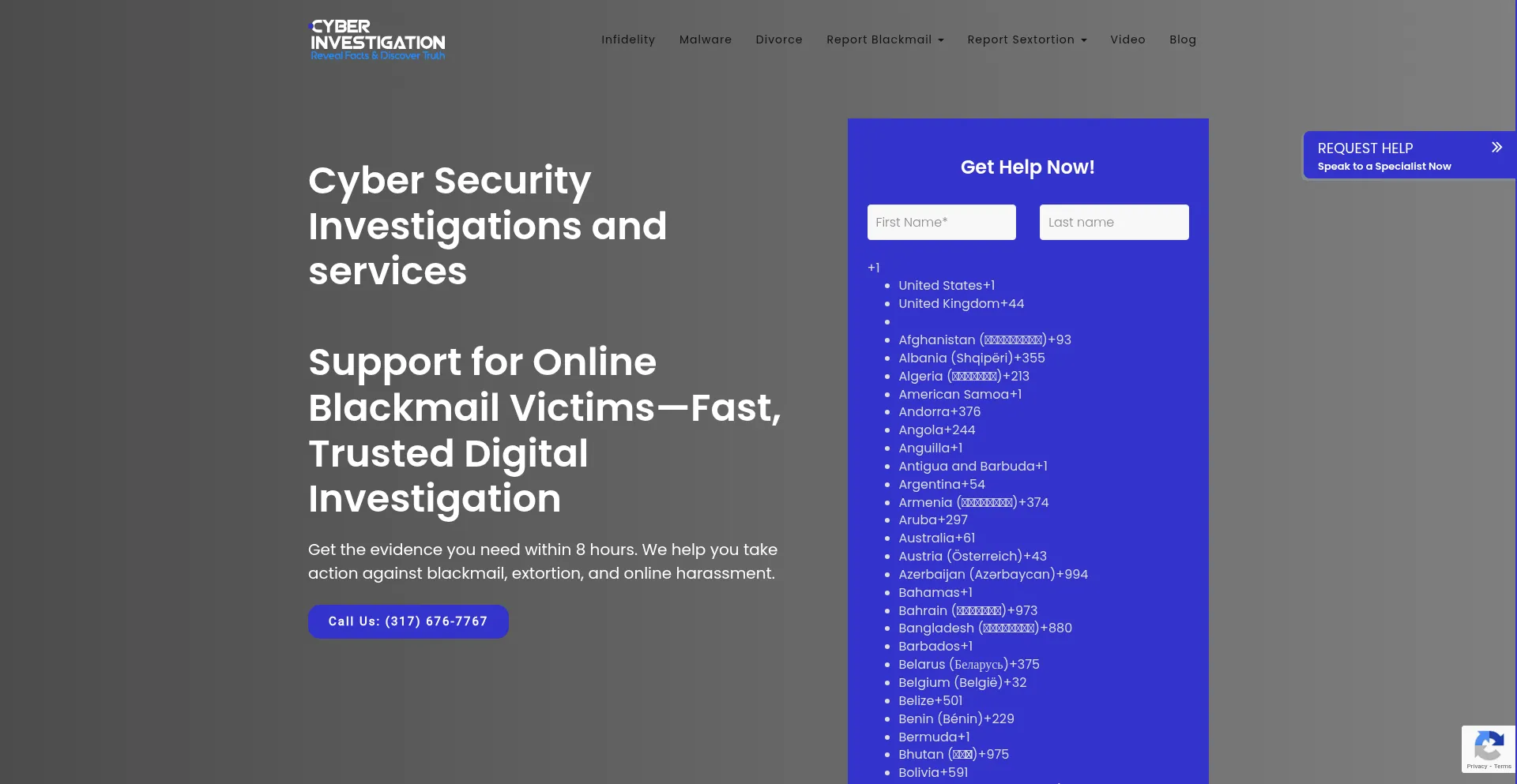该网站实现数据收集表单,请求个人信息,包括姓名、电子邮件地址、电话号码或其他敏感详细信息。用户应验证 cyberinvestigation.com 的合法性并在提交个人数据前查看隐私政策。