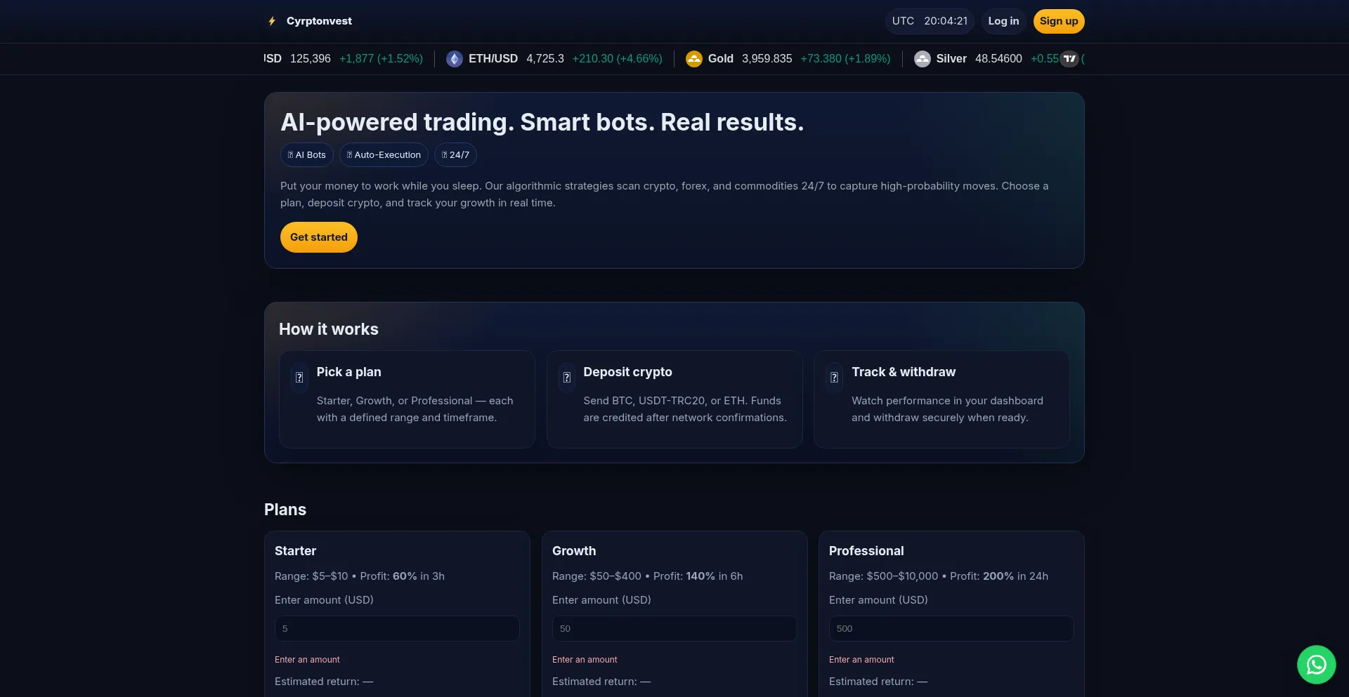 Cyrptonvest uses algorithmic strategies and 24/7 AI trading bots to grow your capital. Choose a plan, deposit crypto, and track results in real time.