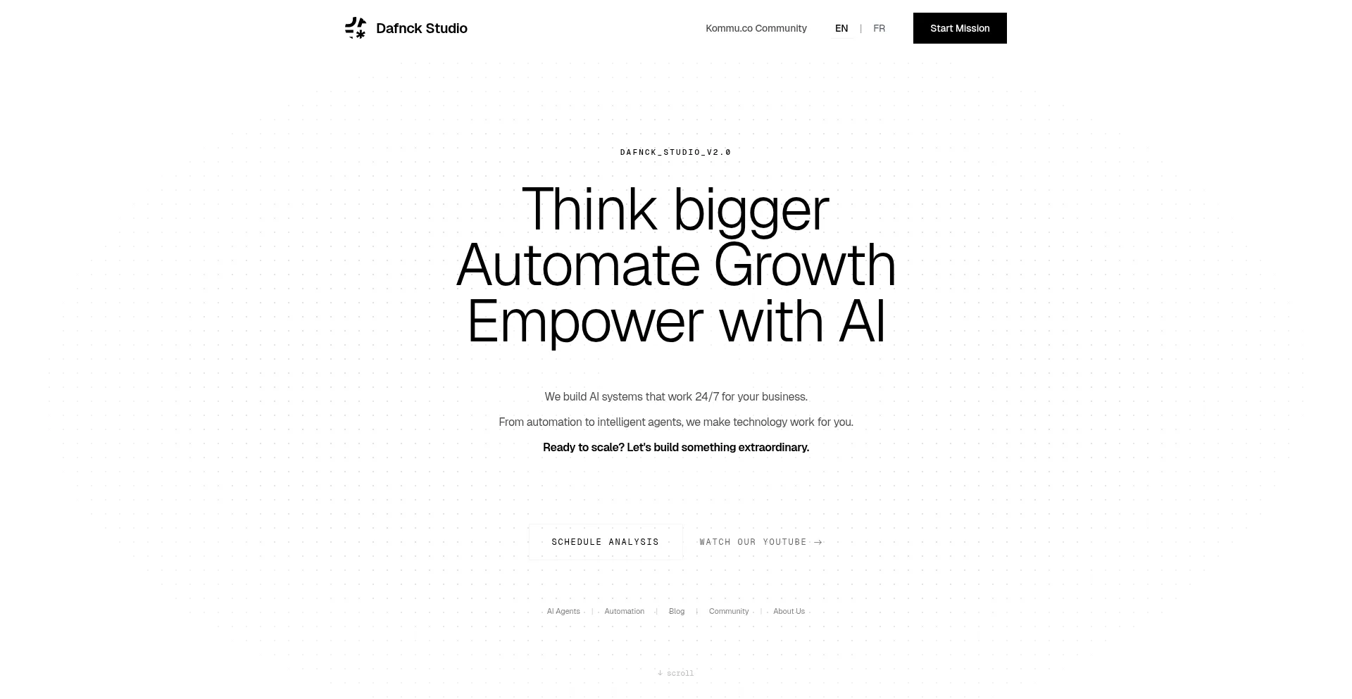 Build your AI-powered business with custom automation, team systems, and expert training. Dafnck Studio delivers complete AI solutions that scale.
