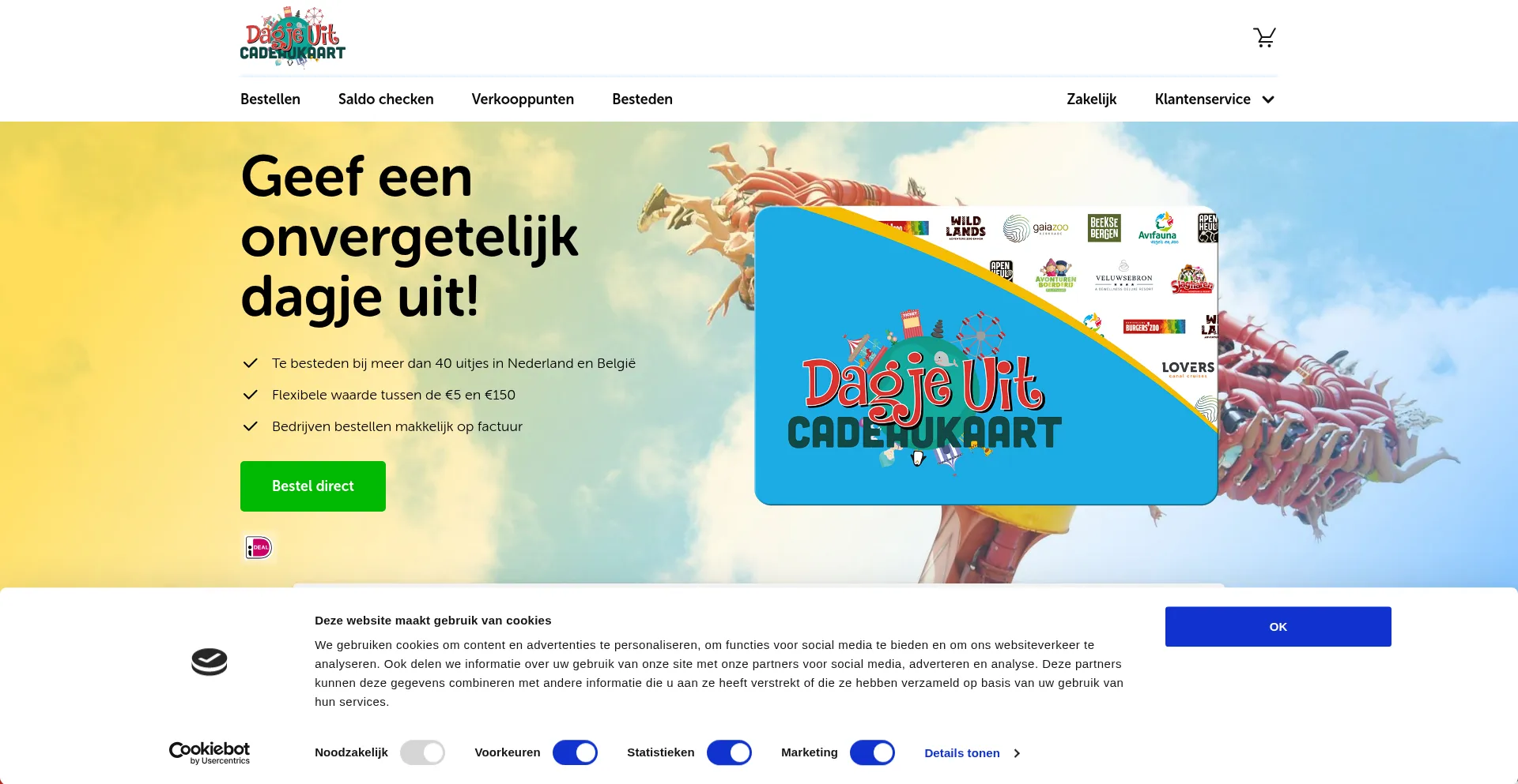 Dagje Uit Cadeaukaart te besteden aan tientallen uitjes in NL & BE. Voor 17 uur besteld, dezelfde dag verstuurd. Bestel snel & eenvoudig online!