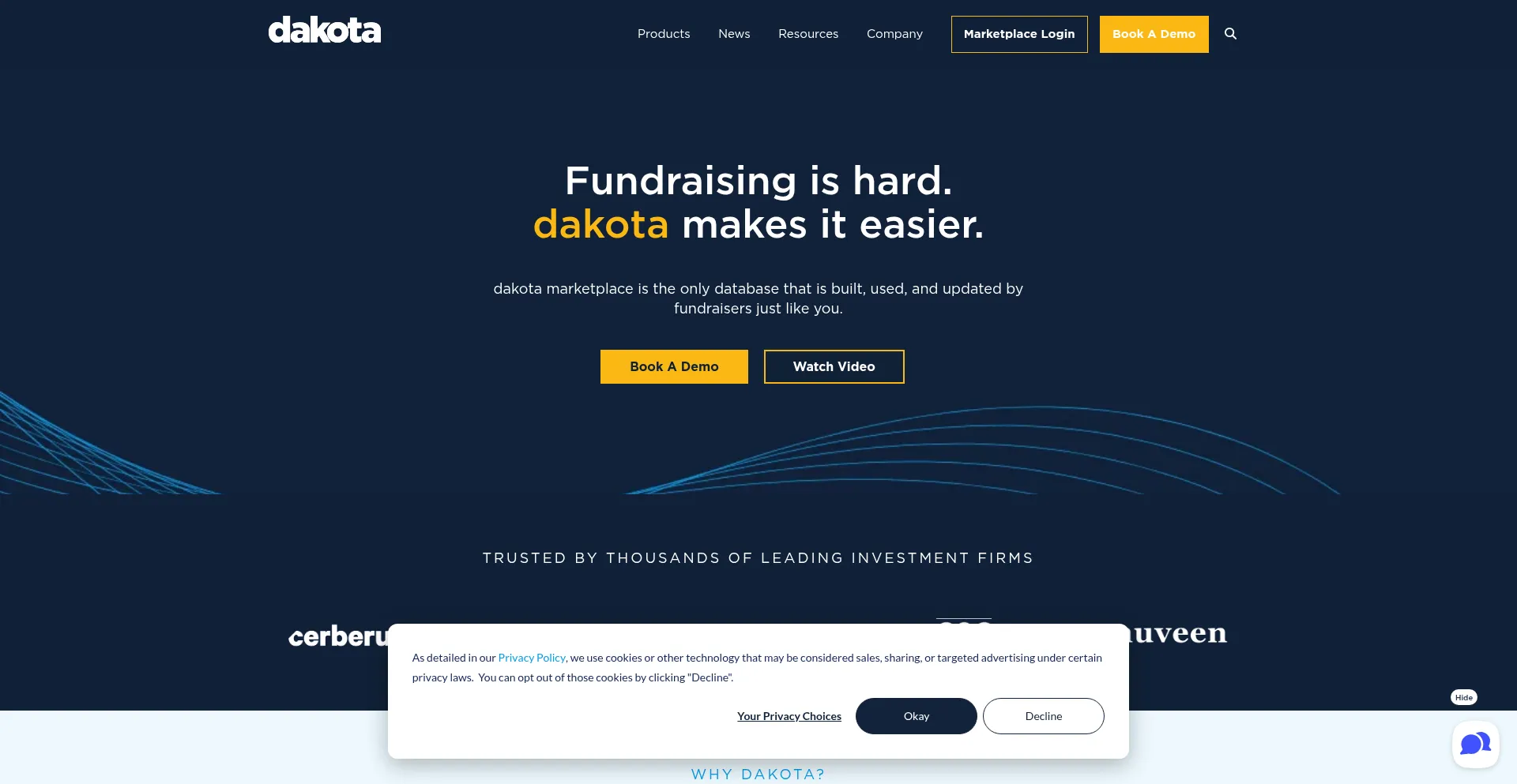 该网站实现符合GDPR或CCPA等隐私法规的cookie同意机制。这表明 dakota.com 遵守数据保护标准并为用户提供对个人数据收集实践的控制。