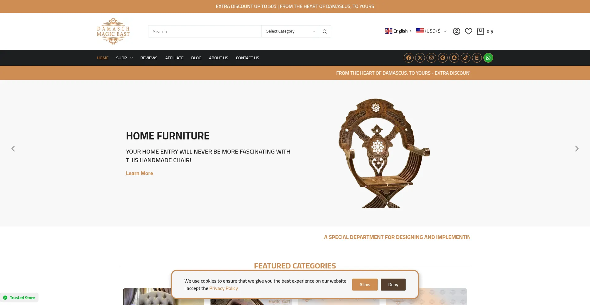 网站上存在社交媒体链接表明 damaschmagiceast.com 在社交媒体上维护官方账户,这是可信度和参与度的积极信号。