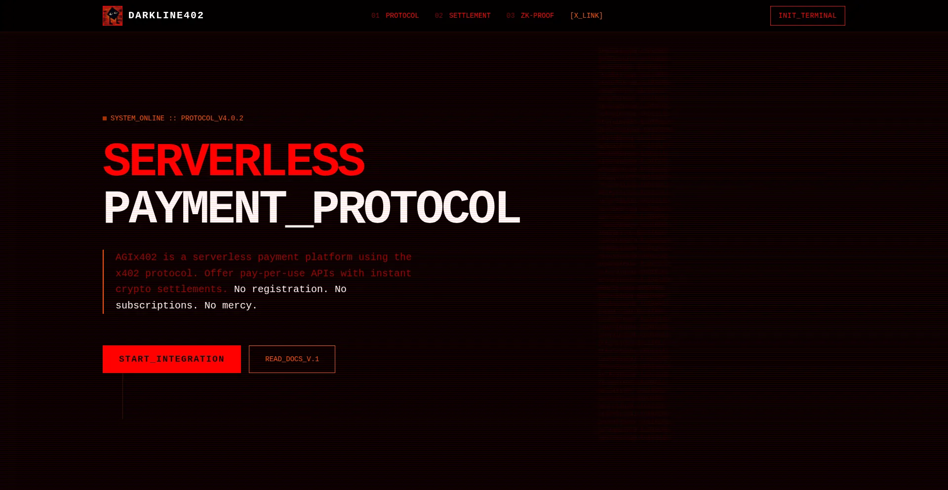 DARKLINE402 AGIx402 serverless payment platform using the x402 protocol. Pay-per-use APIs with instant crypto settlements.
