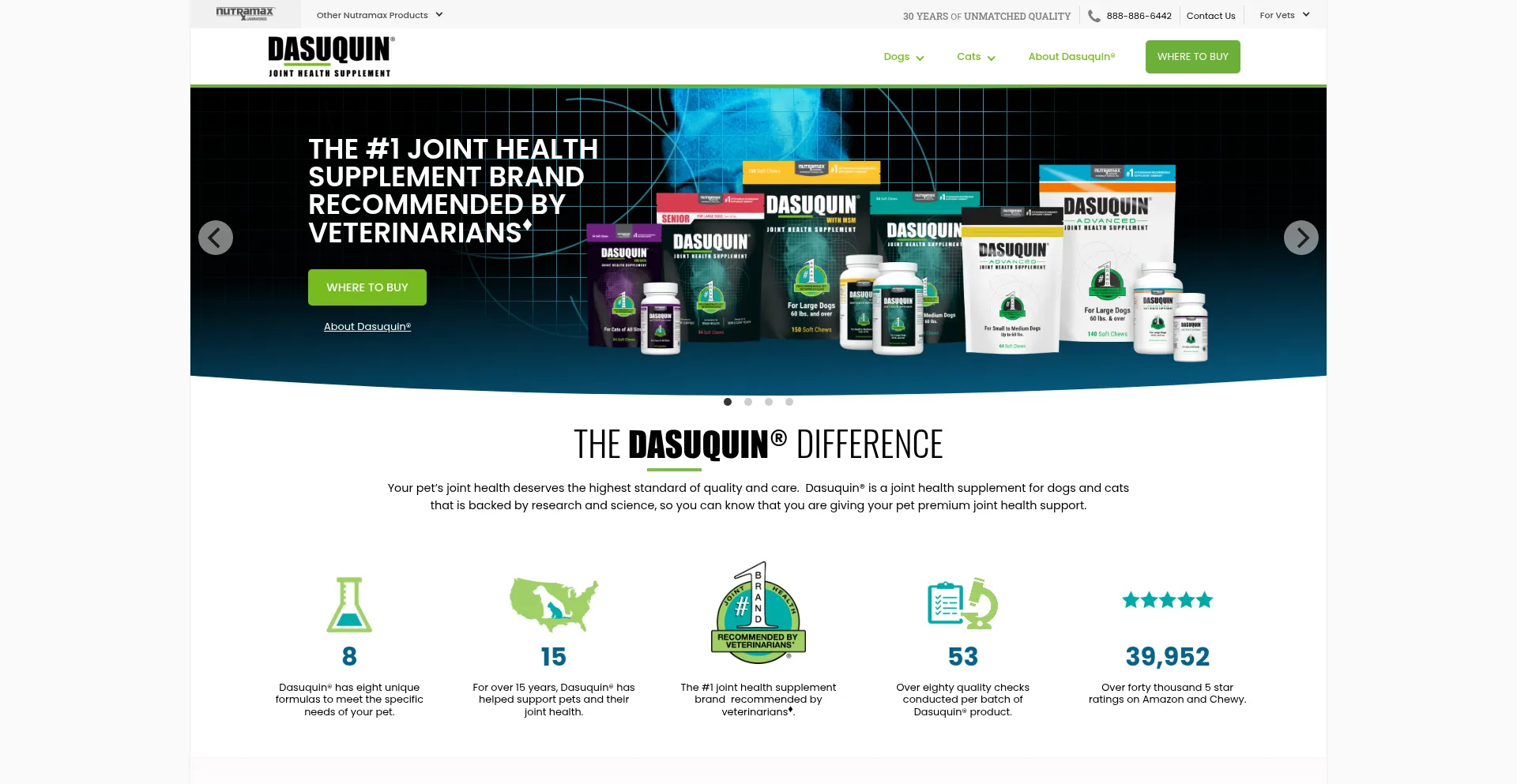 Dasuquin® is a premium joint health supplement for dogs and cats, manufactured by Nutramax Laboratories Veterinary Sciences, the #1 Veterinarian Recommended Supplement Company.*