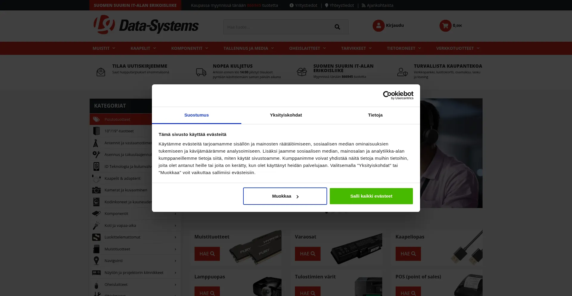 分析表明 data-systems.fi 作为电子商务平台运营,促进商品或服务的在线交易。该网站实现了购物车功能、支付处理系统和产品目录功能,这些是商业零售运营的典型特征。