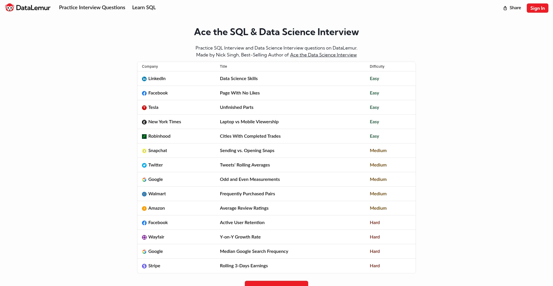 Practice SQL Interview Questions & Data Science Interview Questions asked by FAANG. Made by Nick Singh, Best-Selling Author of Ace the Data Science Interview.