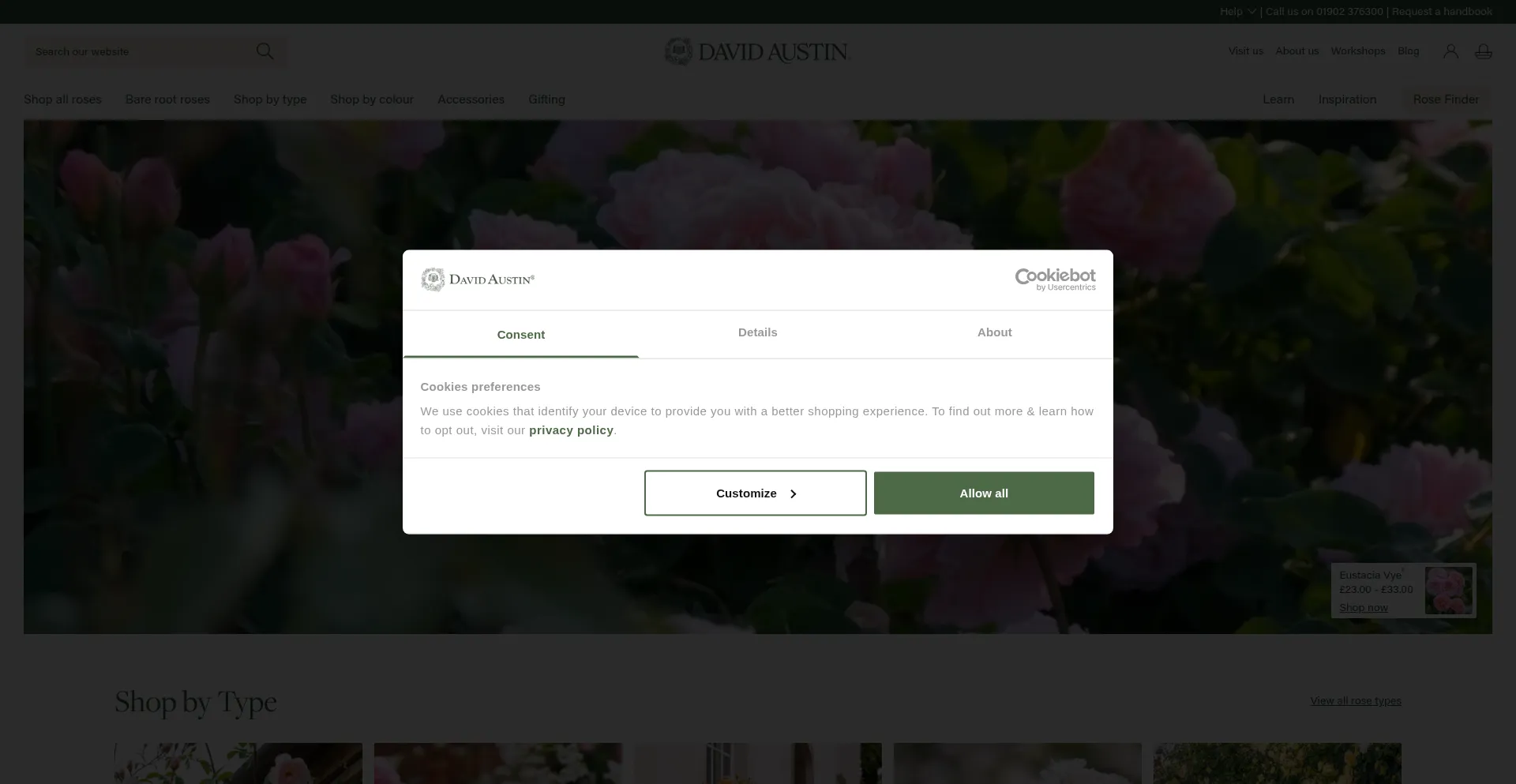 该网站实现符合GDPR或CCPA等隐私法规的cookie同意机制。这表明 davidaustinroses.co.uk 遵守数据保护标准并为用户提供对个人数据收集实践的控制。