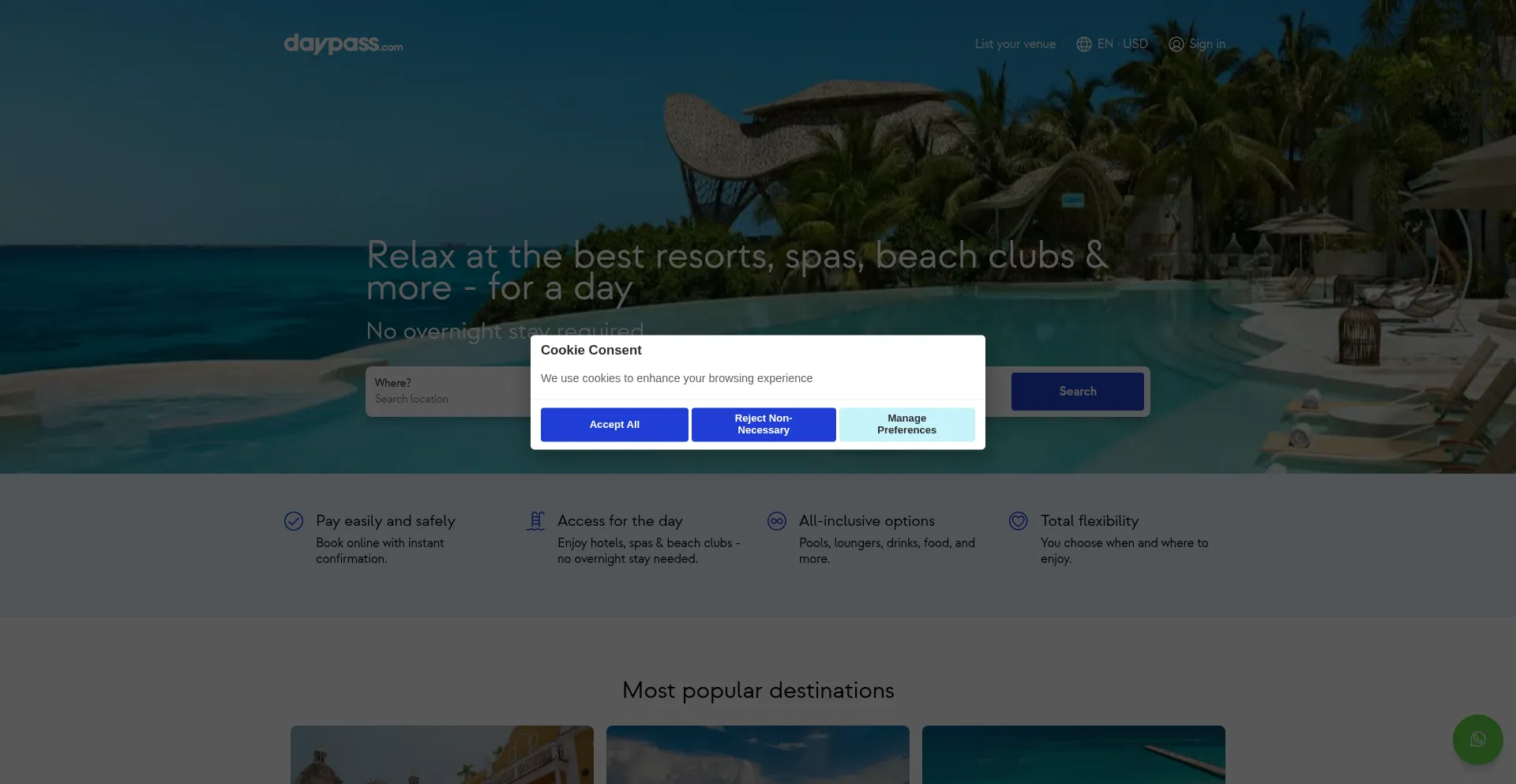 该网站实现符合GDPR或CCPA等隐私法规的cookie同意机制。这表明 daypass.com 遵守数据保护标准并为用户提供对个人数据收集实践的控制。