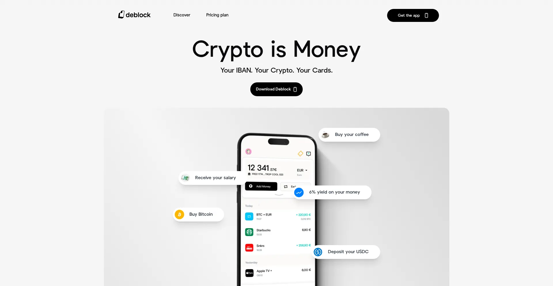 Forget your bank account: Get an IBAN, a Debit Card and a Non-custodial Crypto wallet. Deposit any Crypto on your current account. Exchange Euro and Crypto without any limit.
