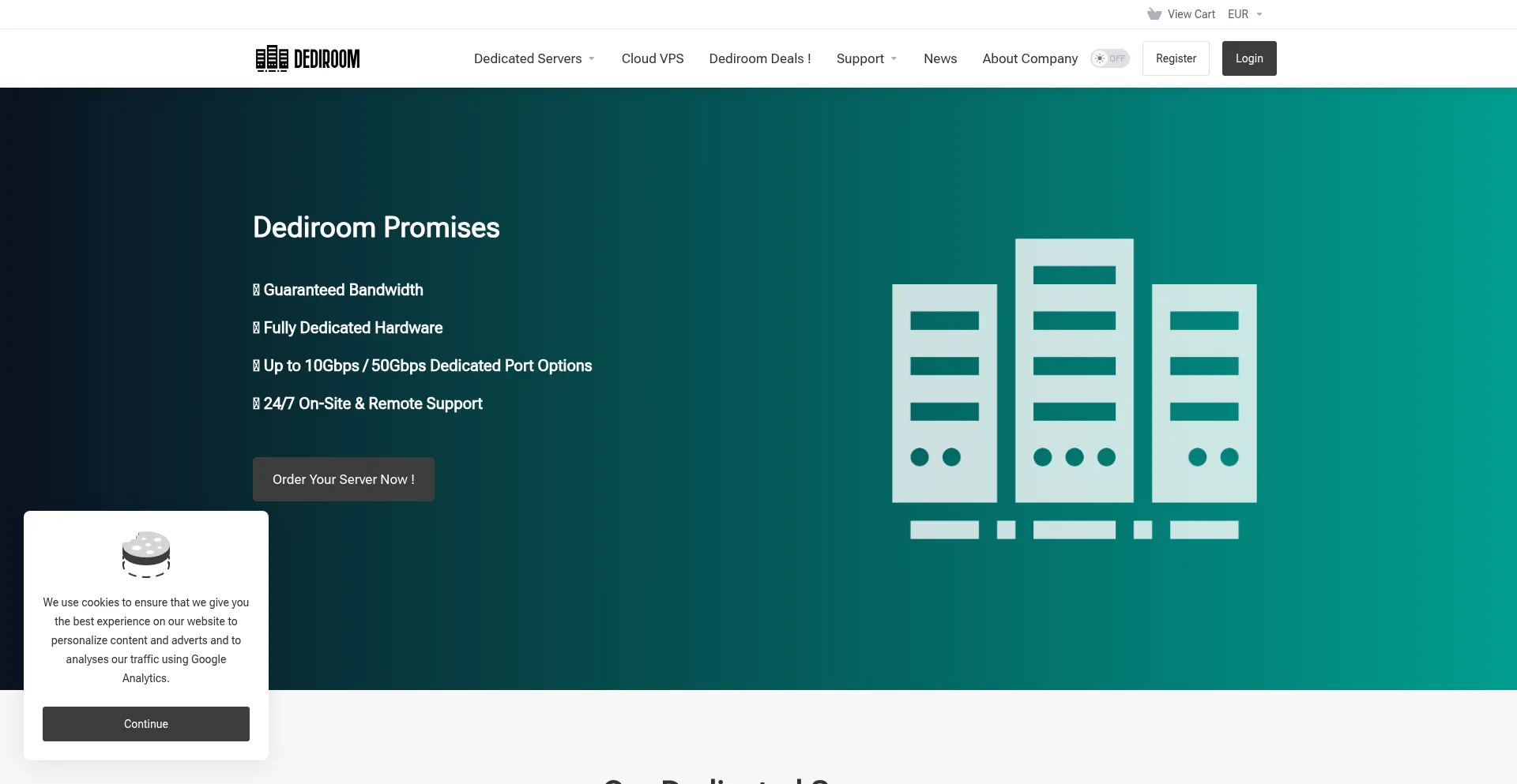 该网站实现符合GDPR或CCPA等隐私法规的cookie同意机制。这表明 dediroom.com 遵守数据保护标准并为用户提供对个人数据收集实践的控制。