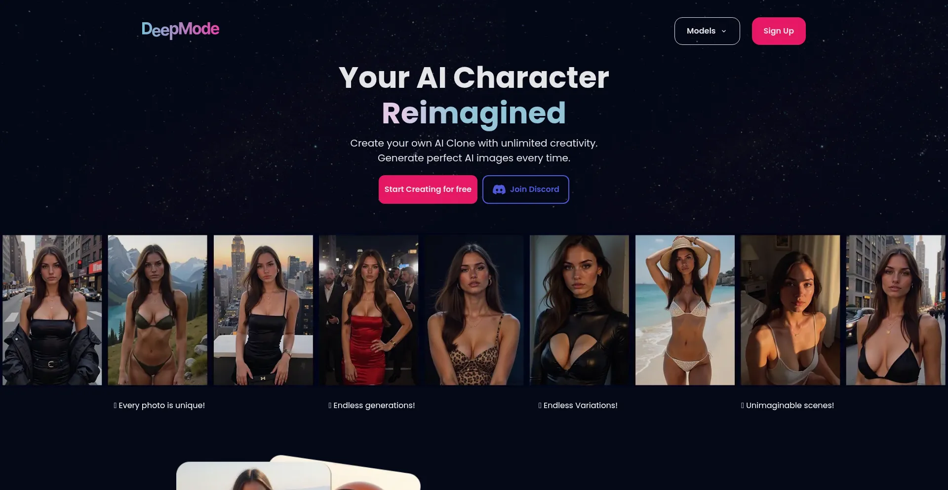Create unique AI-generated art with DeepMode. Our advanced AI models let you design custom characters and produce stunning digital images. Explore the future of AI-powered creat...