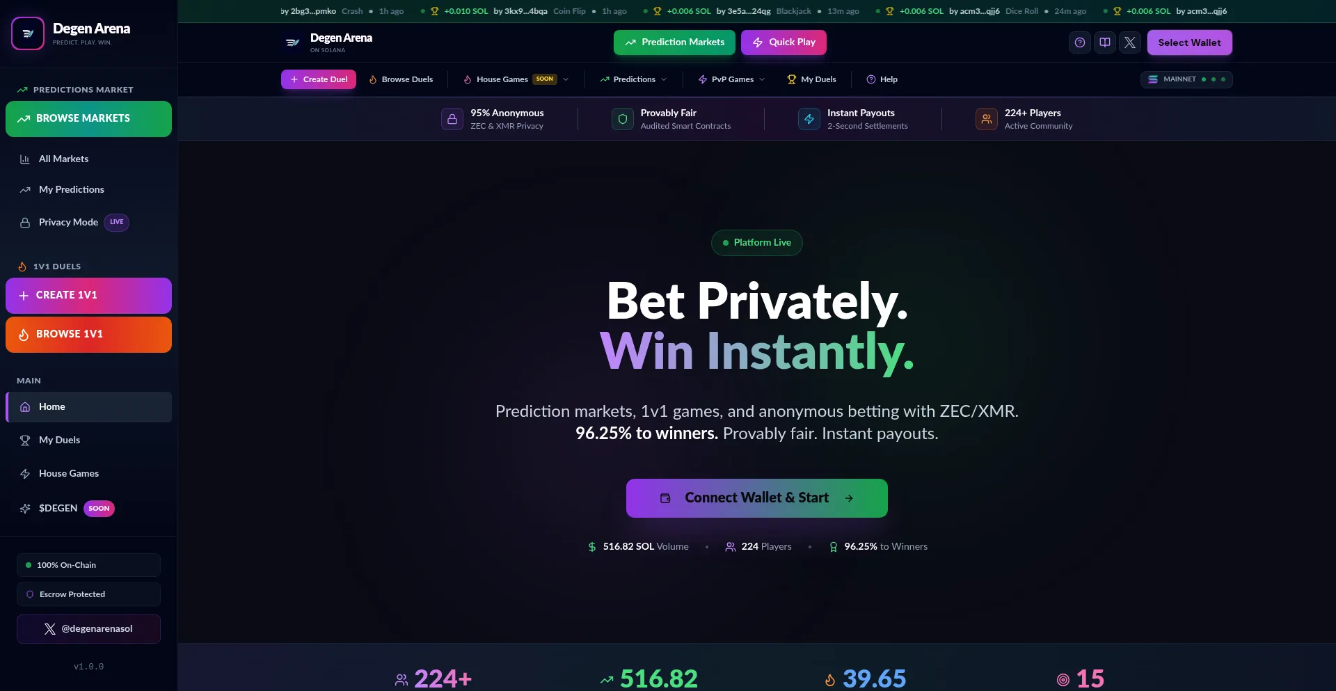 Prediction markets & competitive games with SOL stakes on Solana. Blackjack, UNO, Crash, Coin Flip, and more. Winner takes all with verified on-chain results!