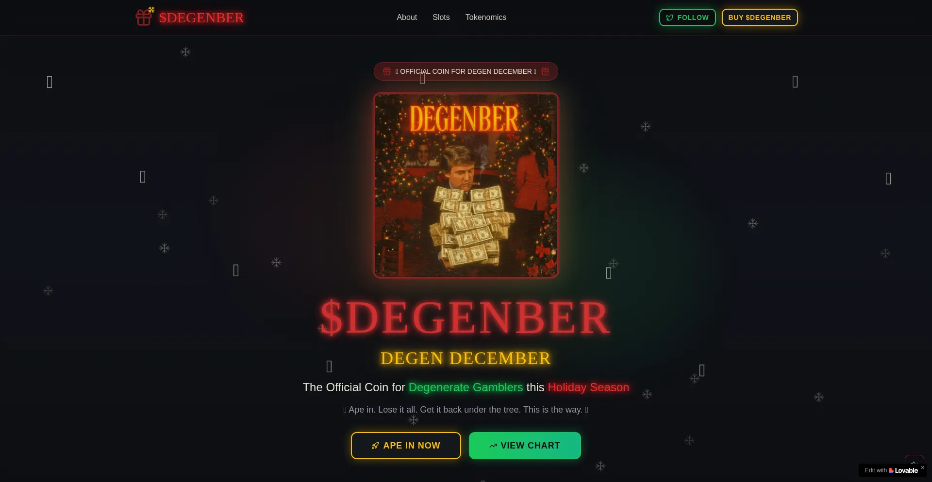 The official memecoin for Degen December. The holiday coin for degenerate gamblers and memecoin apes. Ape in this Christmas season!