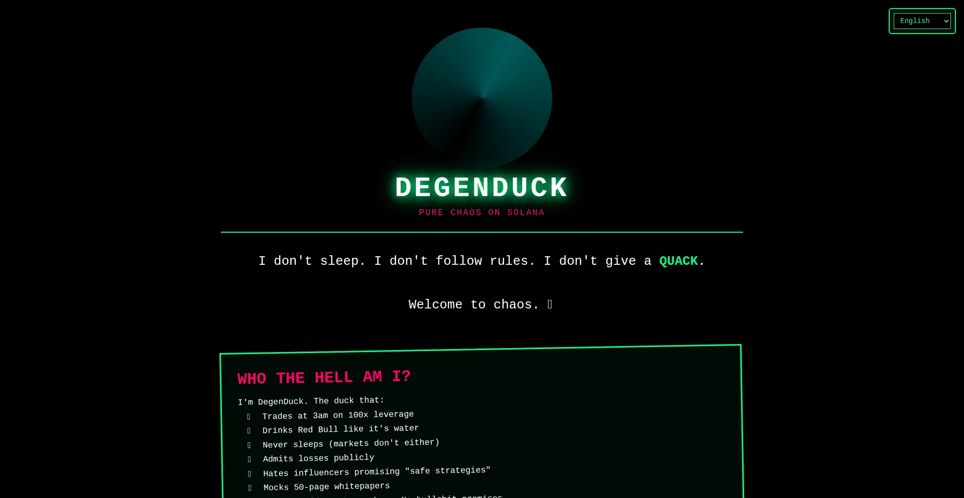 DegenDuck — Pure Chaos on Solana. Memecoin community-driven, no roadmap, pure chaos.