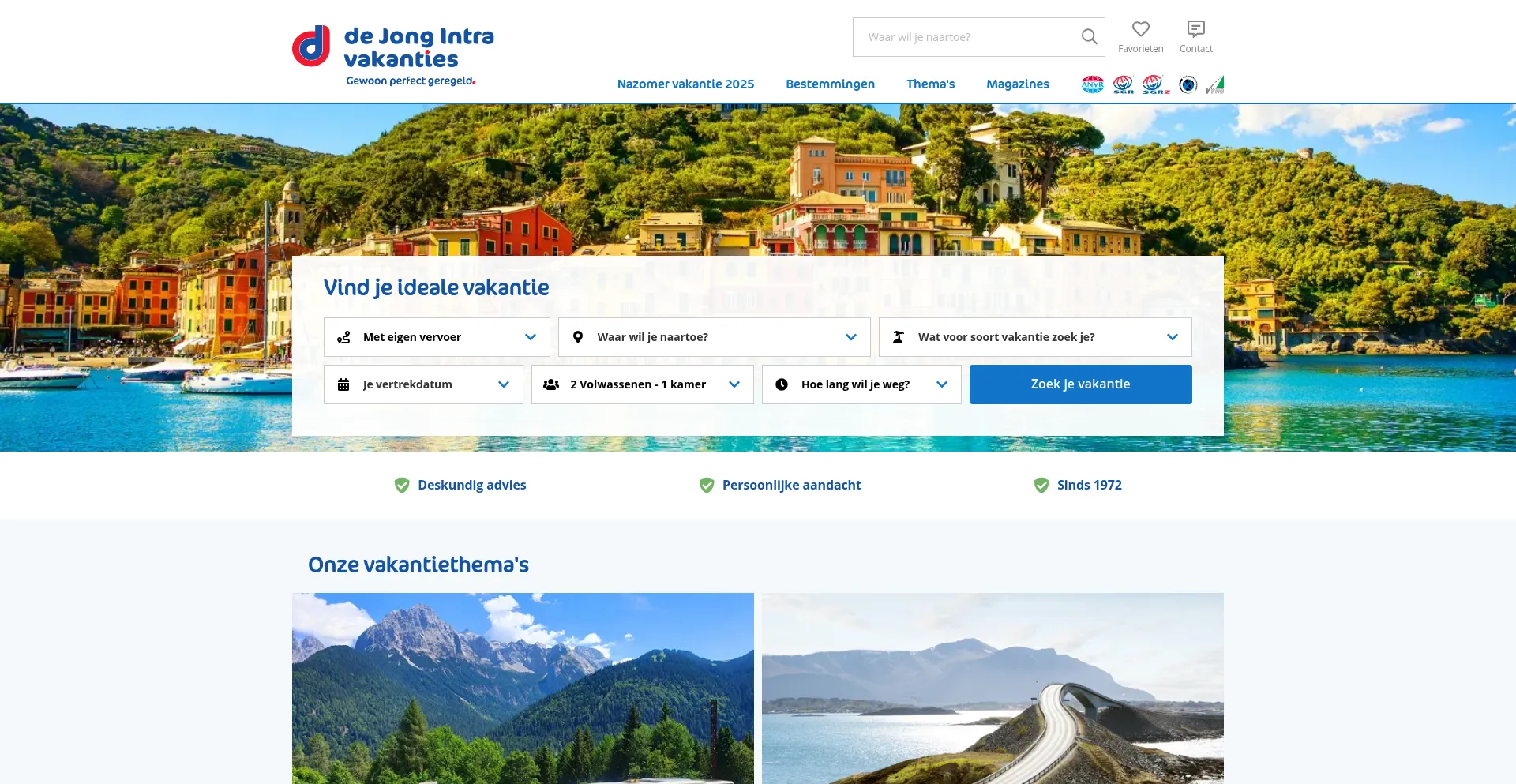 Busreizen, rondreizen, stedentrips en nog veel meer. De Jong Intra heeft altijd een passende vakantie voor jou. Bekijk ons brede assortiment aan vakanties. ANVR, SGR en Calamite...