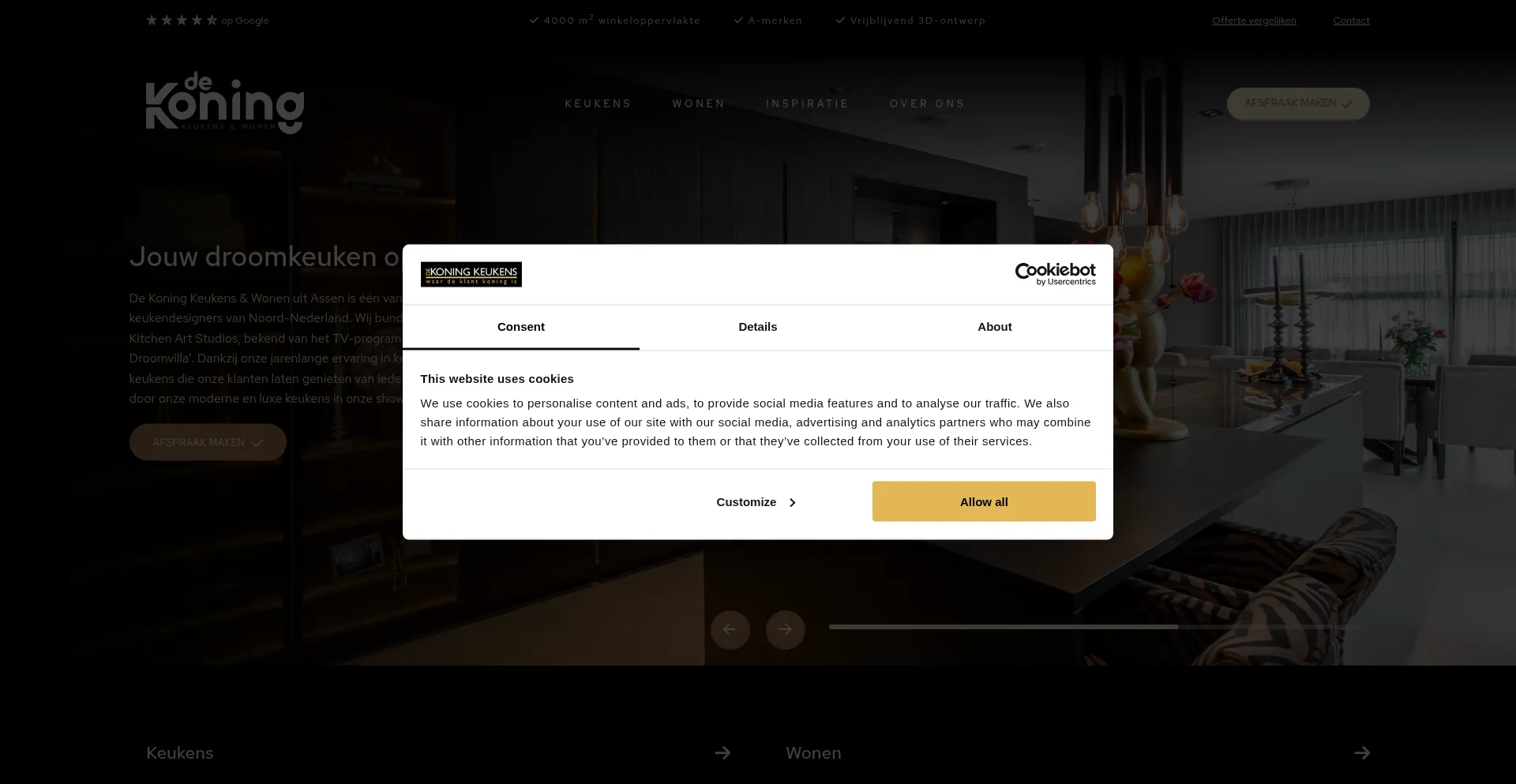 该网站实现符合GDPR或CCPA等隐私法规的cookie同意机制。这表明 dekoningkeukens.nl 遵守数据保护标准并为用户提供对个人数据收集实践的控制。