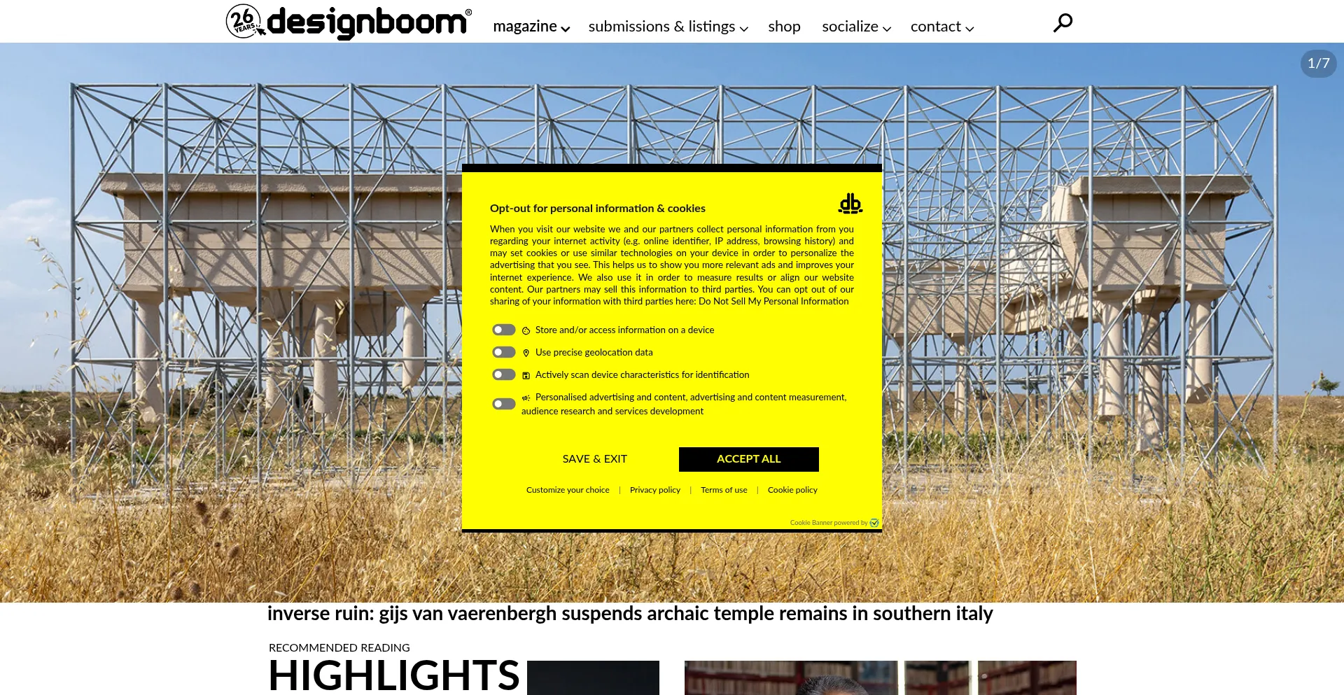 该网站实现符合GDPR或CCPA等隐私法规的cookie同意机制。这表明 designboom.com 遵守数据保护标准并为用户提供对个人数据收集实践的控制。
